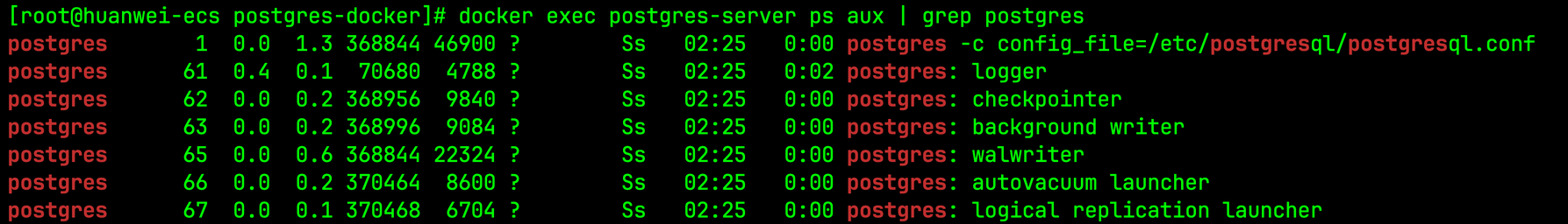 docker exec postgres-server ps aux | grep postgres