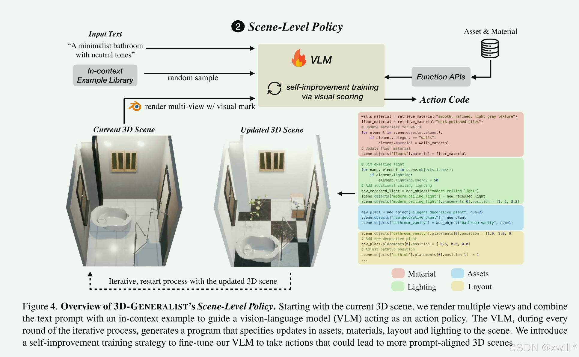 场景级策略(搞软装和氛围): 一个VLM(视觉语言模型)充当总指挥。它负责选家具、换材质、调灯光。它会不断地看当前场景,然后进行微调。