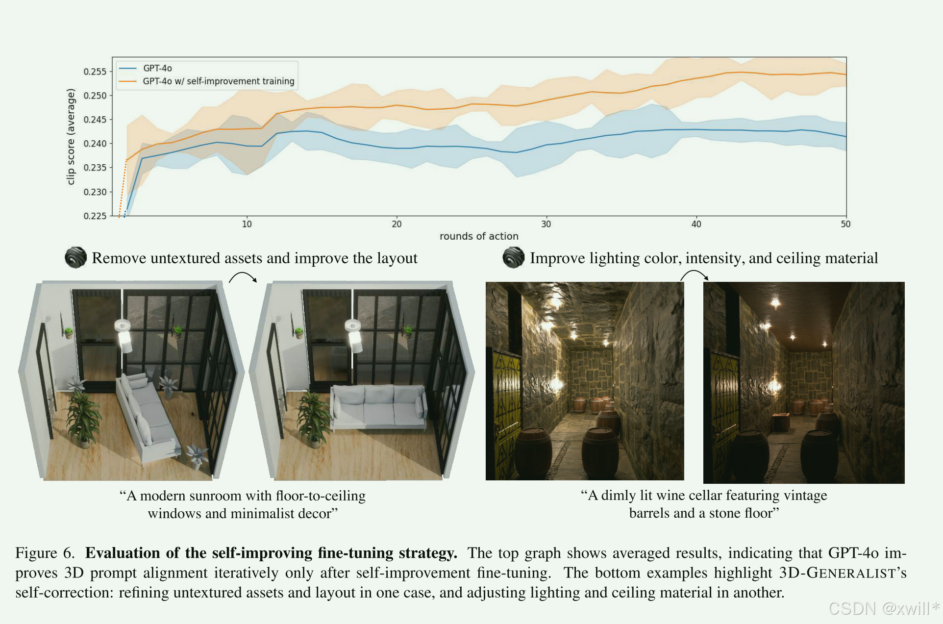 (b) 自我改进微调的有效性: 我们提出的自我改进微调策略(self-improvement fine-tuning strategy) 是否使**场景级策略(Scene-Level Policy)**能够迭代地细化 3D 环境,使其更符合提示词(prompt-aligned)?