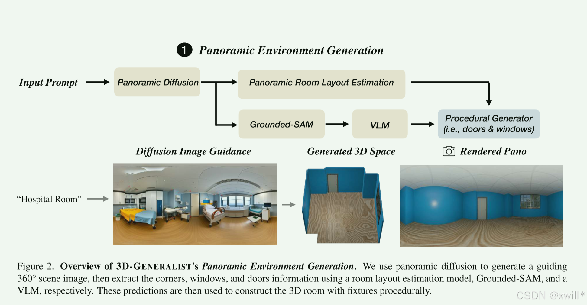 全景环境生成(搞基建): 先根据文字生成一张全景图,然后反推生成房间的墙壁、门窗位置(硬装)。