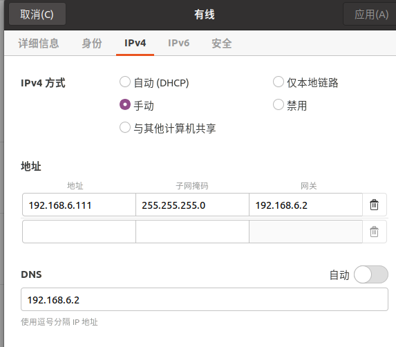 打开有线设置的,IPv4改为手动,DNS关闭自动