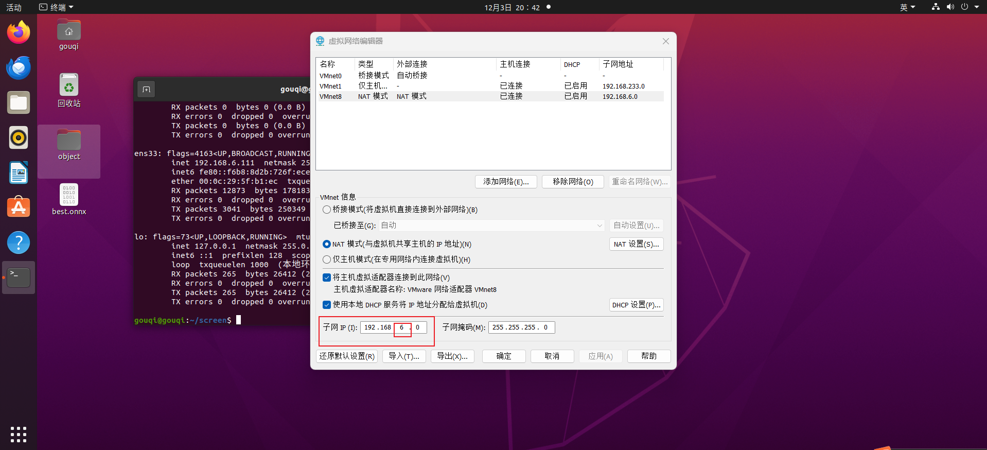 打开网络编辑器,修改成NAT模式和更改子网IP的第三个,我这里修改为6。