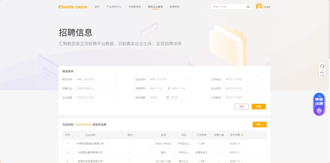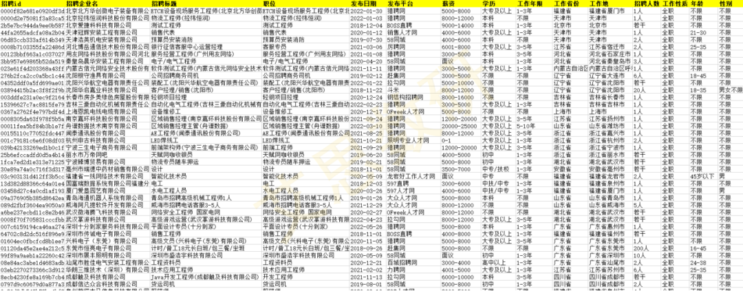 针对上述痛点,【艾思产研数据平台】招聘数据库(大全)提供了一个专业解决方案。作为目前市面上数据更全 、分类更细 、更新速度更快 的数据库,该库库收录了2012年1月至今 ,51job、boss直聘、智联招聘、猎聘、拉勾网、58同城等主流招聘网站发布的超过1 4亿条 招聘信息,整理出26个 关键字段。数据库保持日更频率,为研究的"连续性"提供坚实保障。