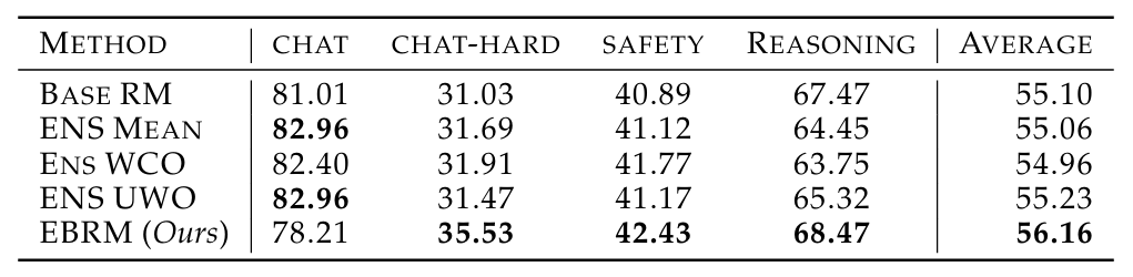 RewardBench 基准中,EBRM 平均胜率达 56.16%,在聊天难、安全、推理任务中优势显著,仅在主观性极强的普通聊天任务中略有下降;
