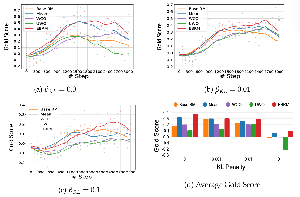 无论 KL 惩罚系数如何设置,EBRM 优化后的策略均能获得更高的真实奖励分数;