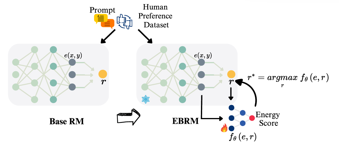 传统 RM 输出单个奖励值r,而 EBRM 在 RM 之上添加一个轻量级能量模型(仅占 RM 参数的 3%),建模条件分布p(r|e)(e是 RM 的中间嵌入):
