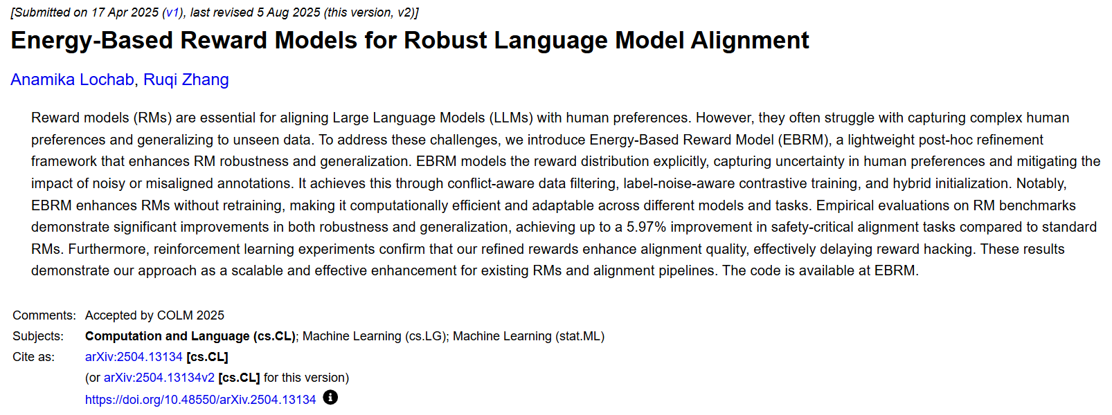 在大语言模型(LLM)对齐中,奖励模型(RM)是连接人类偏好与模型输出的关键,但传统 RM 常因输出固定标量分数,难以捕捉复杂偏好、易受噪声标注影响,还容易被模型 "奖励攻击"(利用漏洞获得高分数却违背人类意图)。2025 年,普渡大学团队在《Conference on Language Modeling(COLM 2025)》提出能量基奖励模型(EBRM) ,通过建模奖励分布而非单点分数,在不重训原有 RM 的前提下,显著提升稳健性与泛化能力,安全关键任务精度最高提升 5.97%,还能延迟奖励攻击的发生。