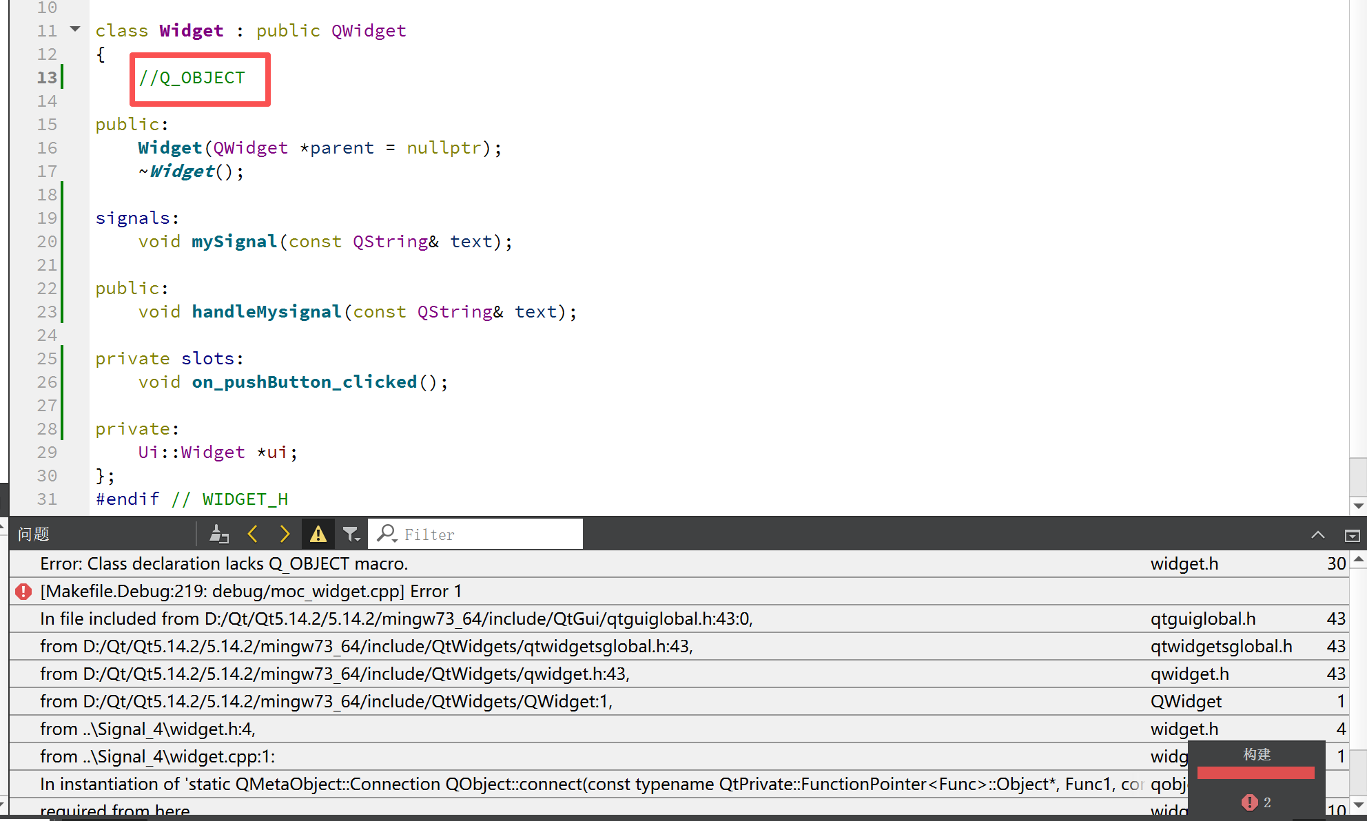 Qt中如果要让某个类能够使用信号槽(可以在类中定义信号和槽函数),则必须要在类最开始的地方,写下Q_OBJECT这个宏。这是Qt中的硬性规定。