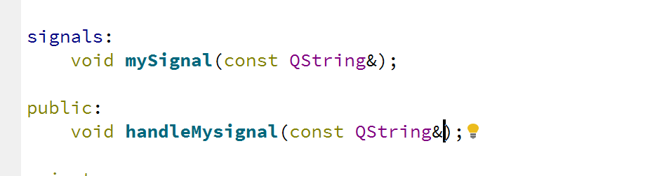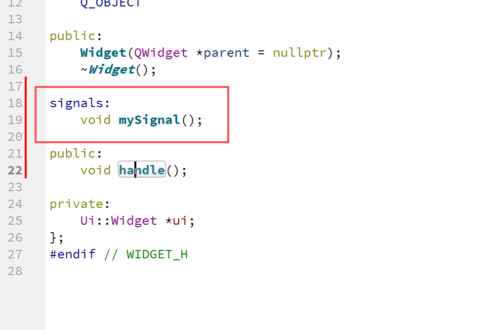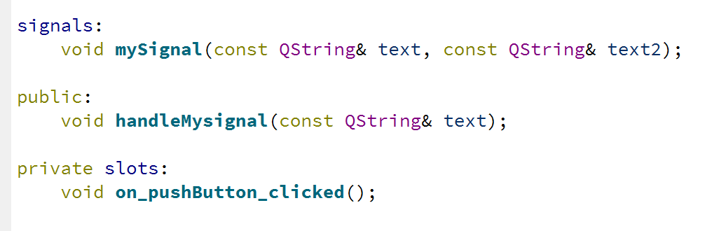 这个也是Qt自己扩展出来的关键词,在qmake的时候,调用一些代码的分析/生成工具,扫描到类中包含signals这个关键字的时候,此时就会自动的把下面的函数声明认为是信号,并且给这些信号函数自动的生成函数定义。