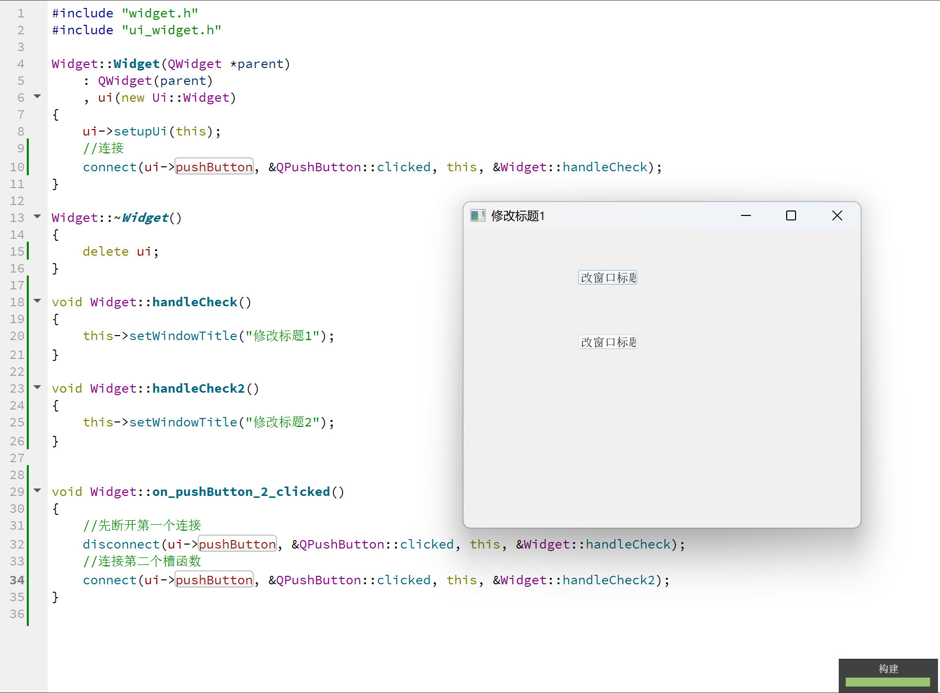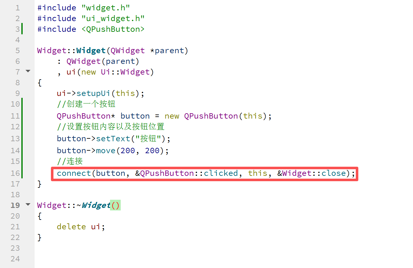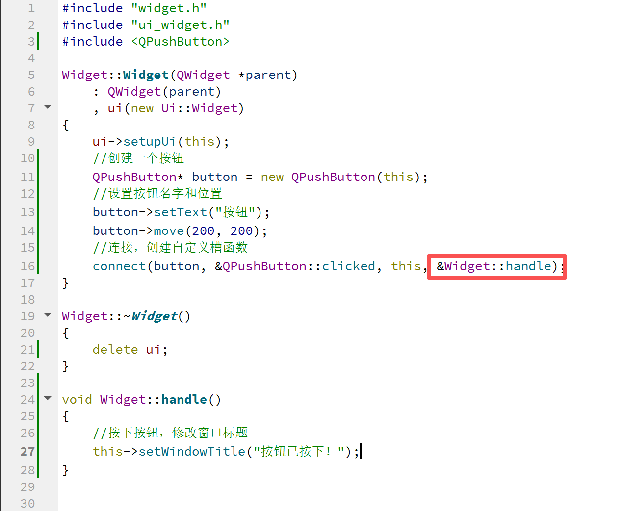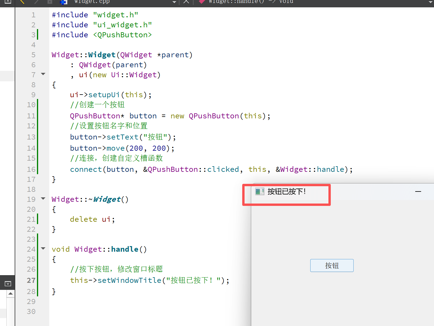 前面我们还是按照上一个例子创建一个按钮,并连接,只是连接的时候槽函数是我们自定义的函数。