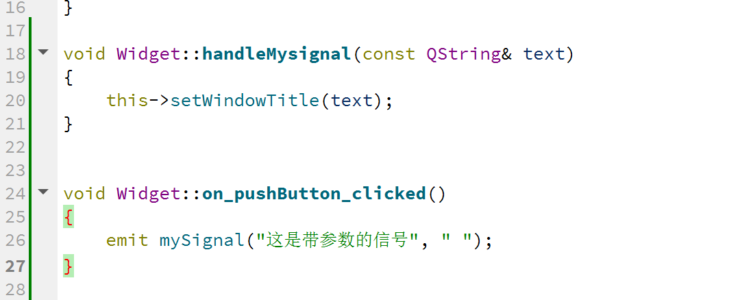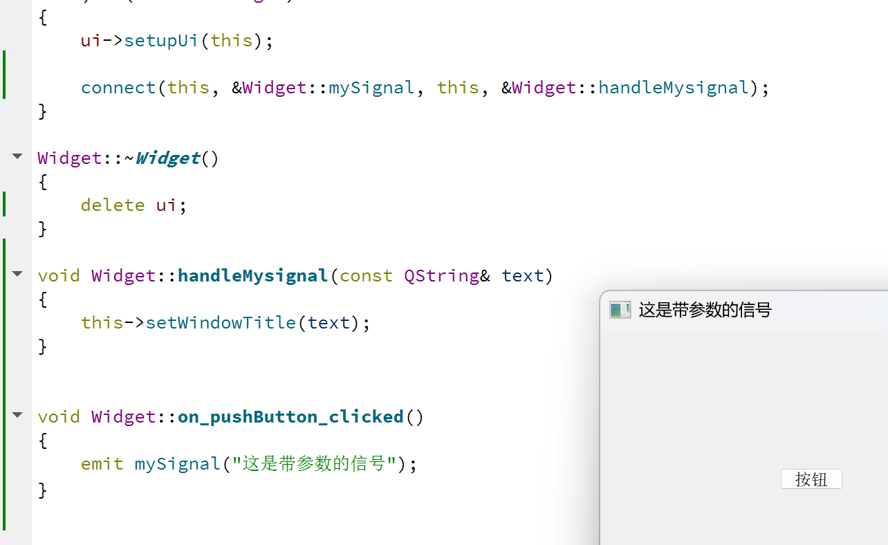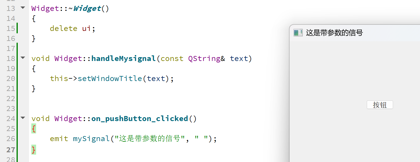 信号和槽也可以带参数,信号带有参数的时候,槽的参数必须和信号的参数一样。此时发射信号的时候就可以给信号函数传递实参,与之对应的这个参数就会被传递到对应的槽函数中。此时就可以起到让信号给槽传递的效果了。