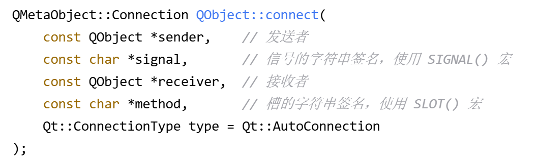 这个函数声明是以前旧版本的Qt的connect函数声明,以前的版本中,传参的写法和现在其实也是有区别的。
