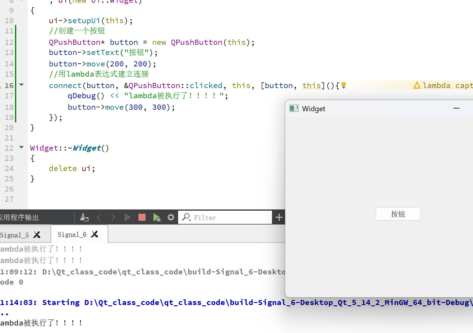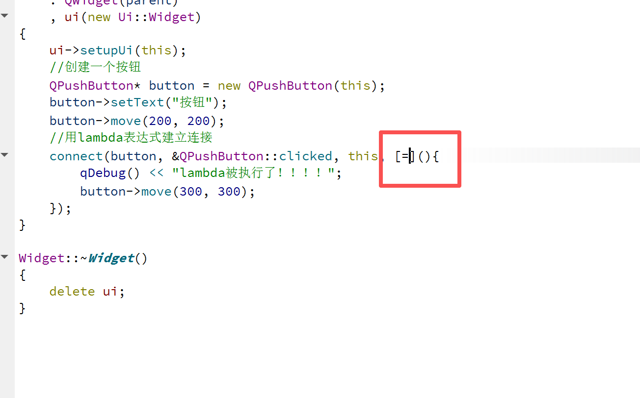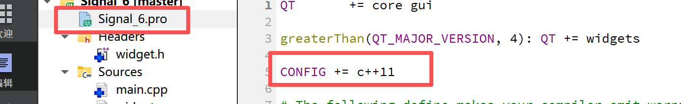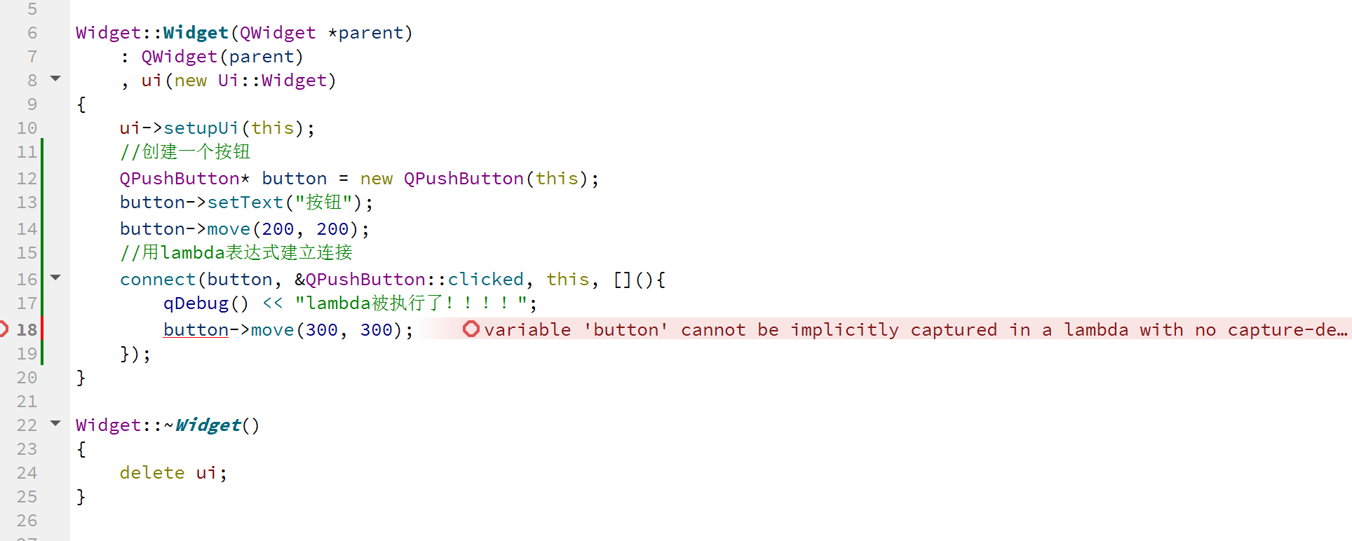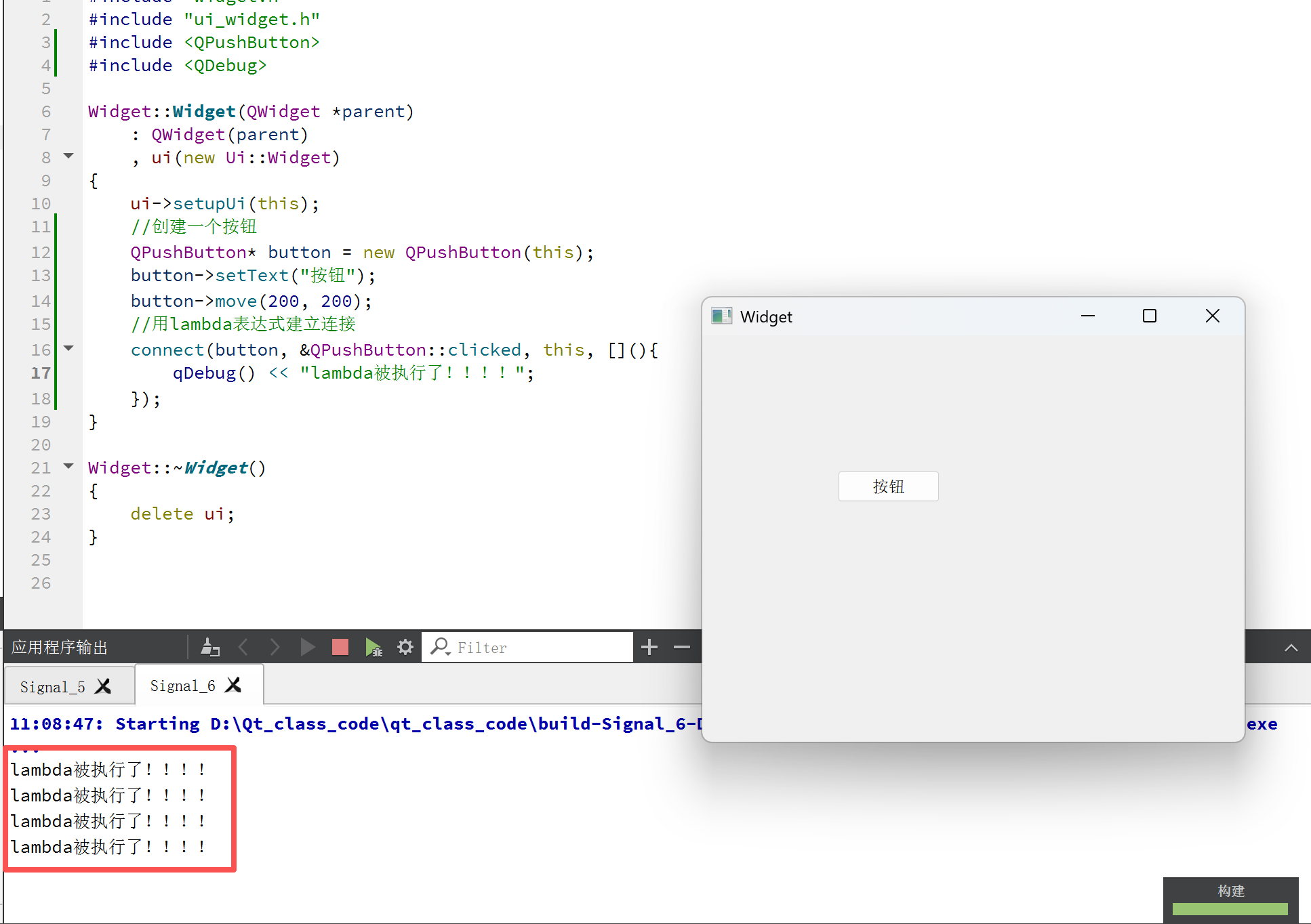 这里需要注意:lambda语法是C++11中引入的,对于Qt5及其更高版本,默认就是按照C++11来编译的,如果使用Qt4或者更老的版本就需要手动在.pro文件中加上C++的编译选项。