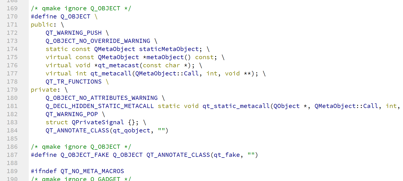 这里的宏还能进一步展开,最终展开的效果会得到一系列很复杂的代码,这些代码就涉及到Qt实现的内部原理了。