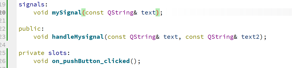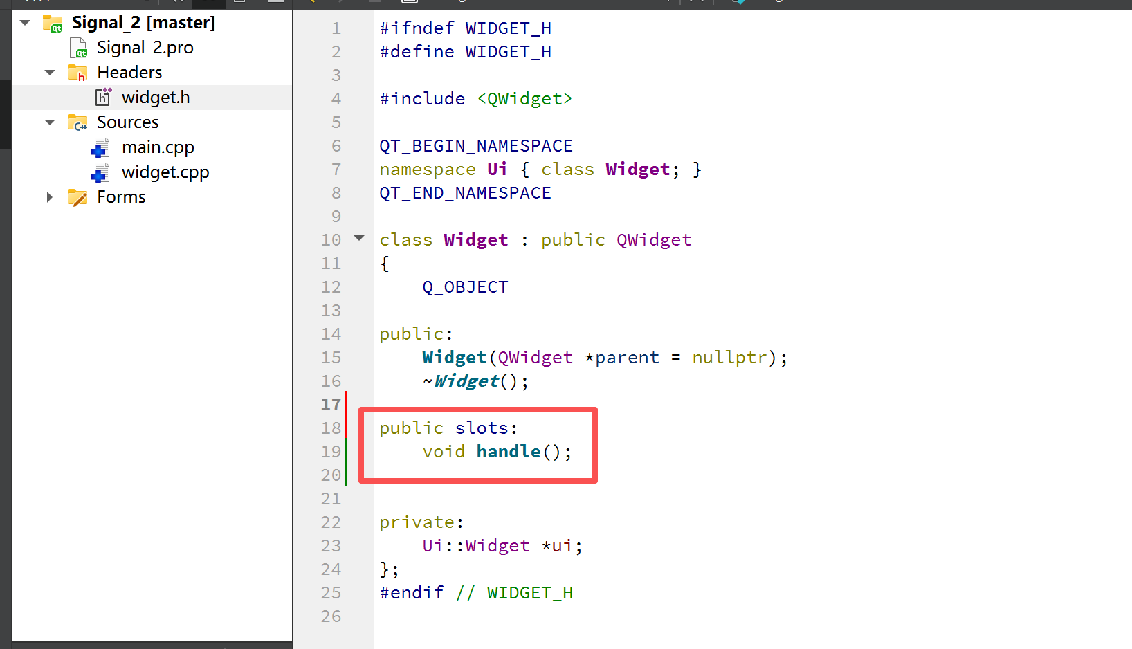 此处的slots是Qt自己扩展的关键字(不是C++标准中的语法),Qt里广泛使用元编程技术(基于代码,生成代码),qmake构建Qt项目的时候,就会调用专门的扫描器,扫描代码中特定的关键字,基于关键字自动生成一大堆相关的代码。