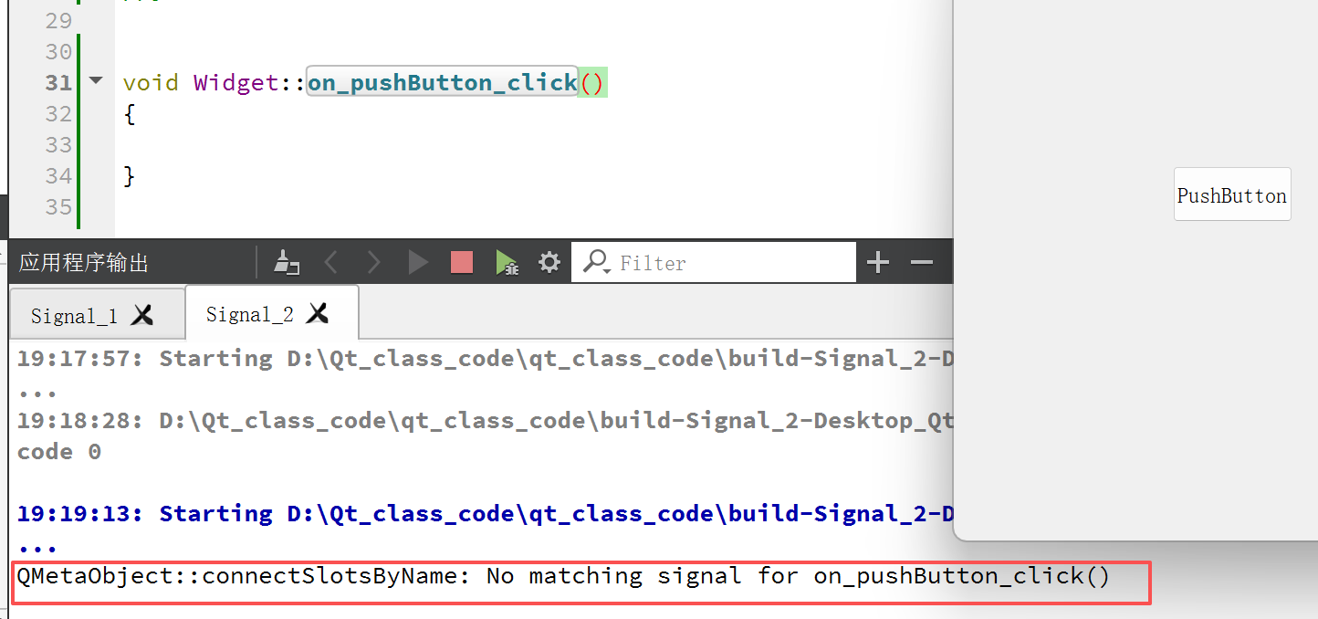我们仔细看一下(黄色框中内容)第一个指的是按钮的objectName,第二个指的是信号的名字。当函数名符合上述规则之后,Qt就能自动的把信号和槽给联系上了。