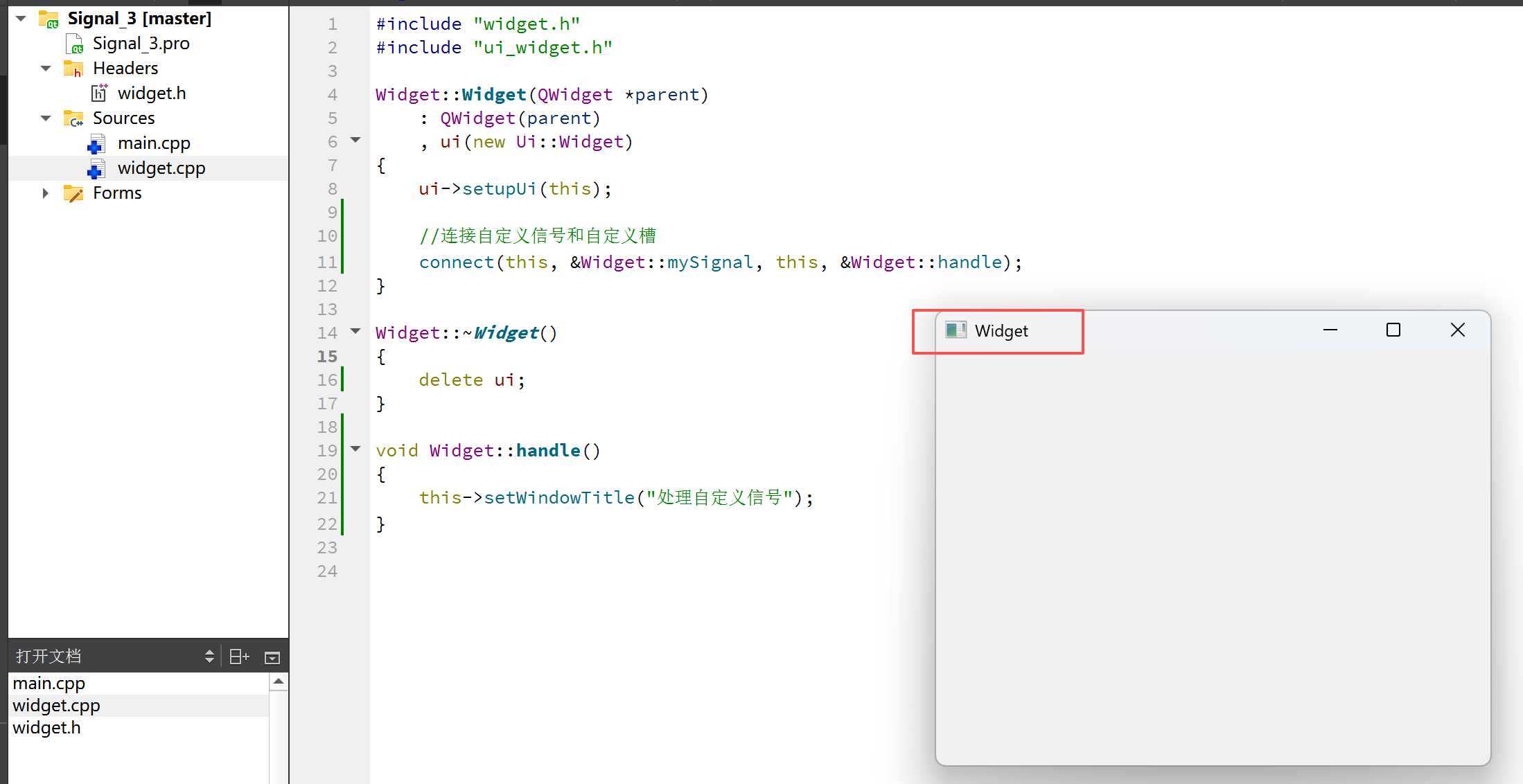 在Widget中虽然还没有定义任何信号,由于继承自QWidget和QObject,这两类里面已经提供了一些信号了,可以直接使用。