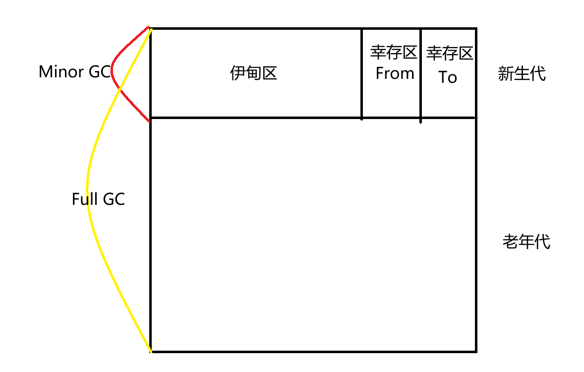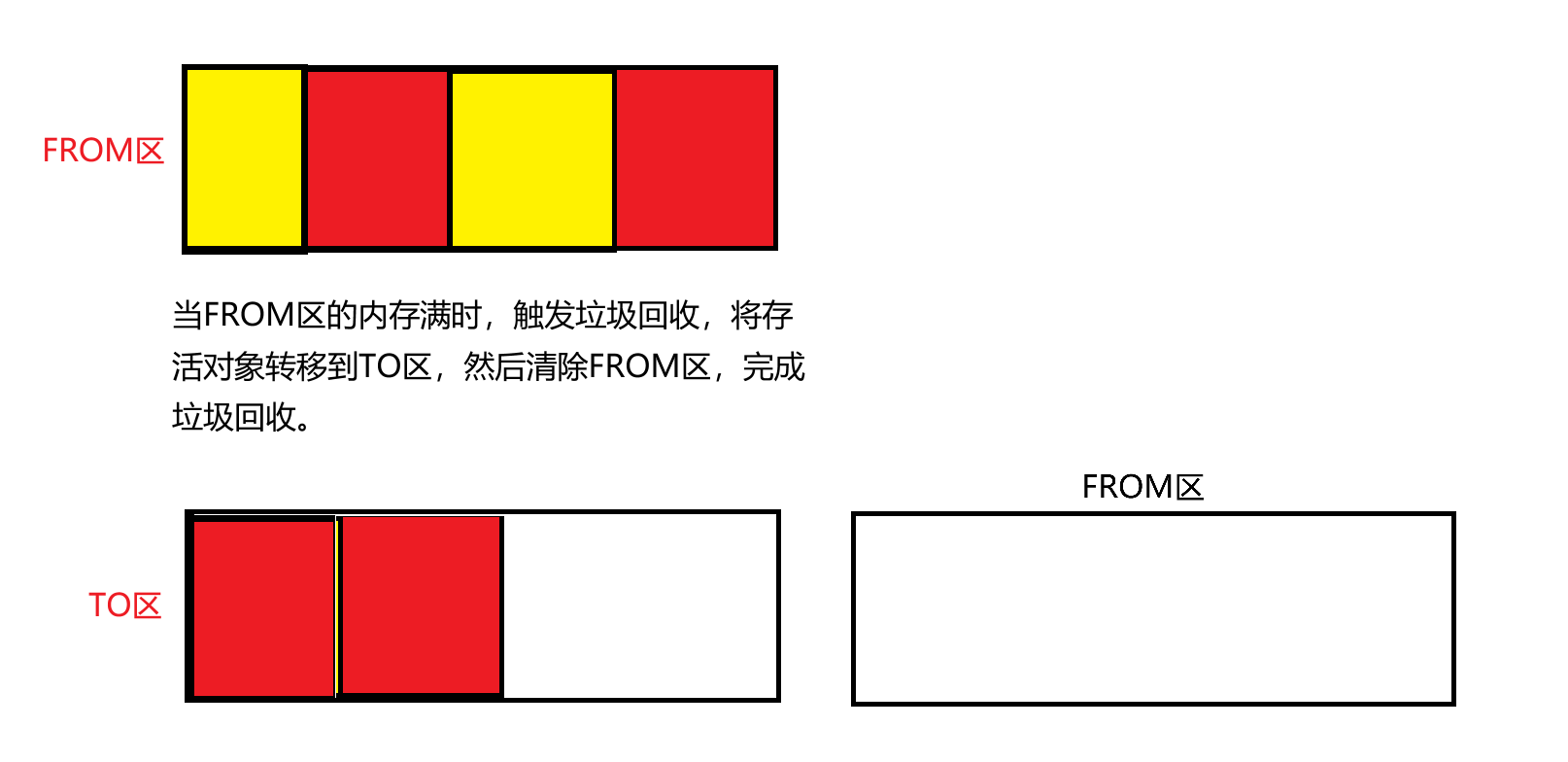 经过第一次的GC后,FROM区会有存活对象,而伊甸区没有对象。