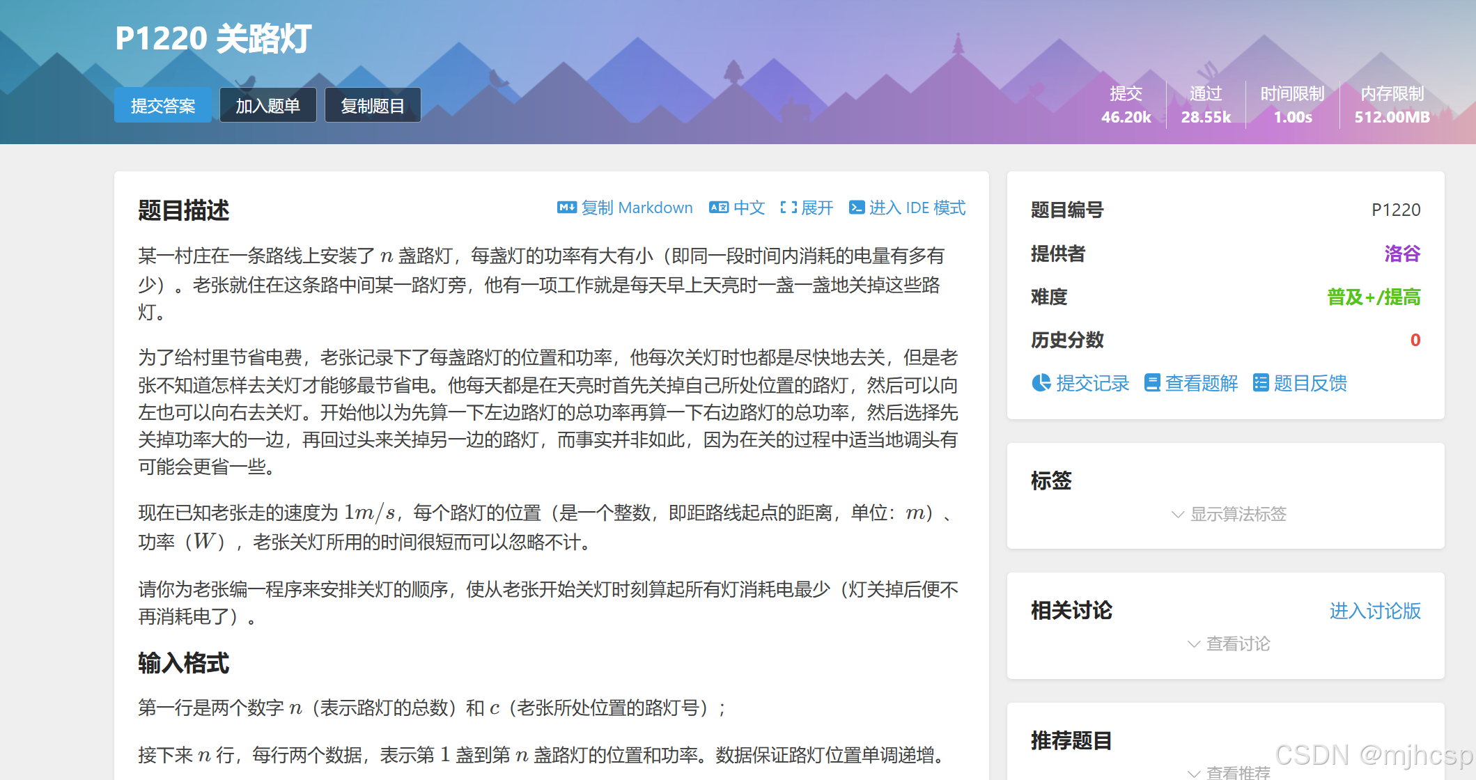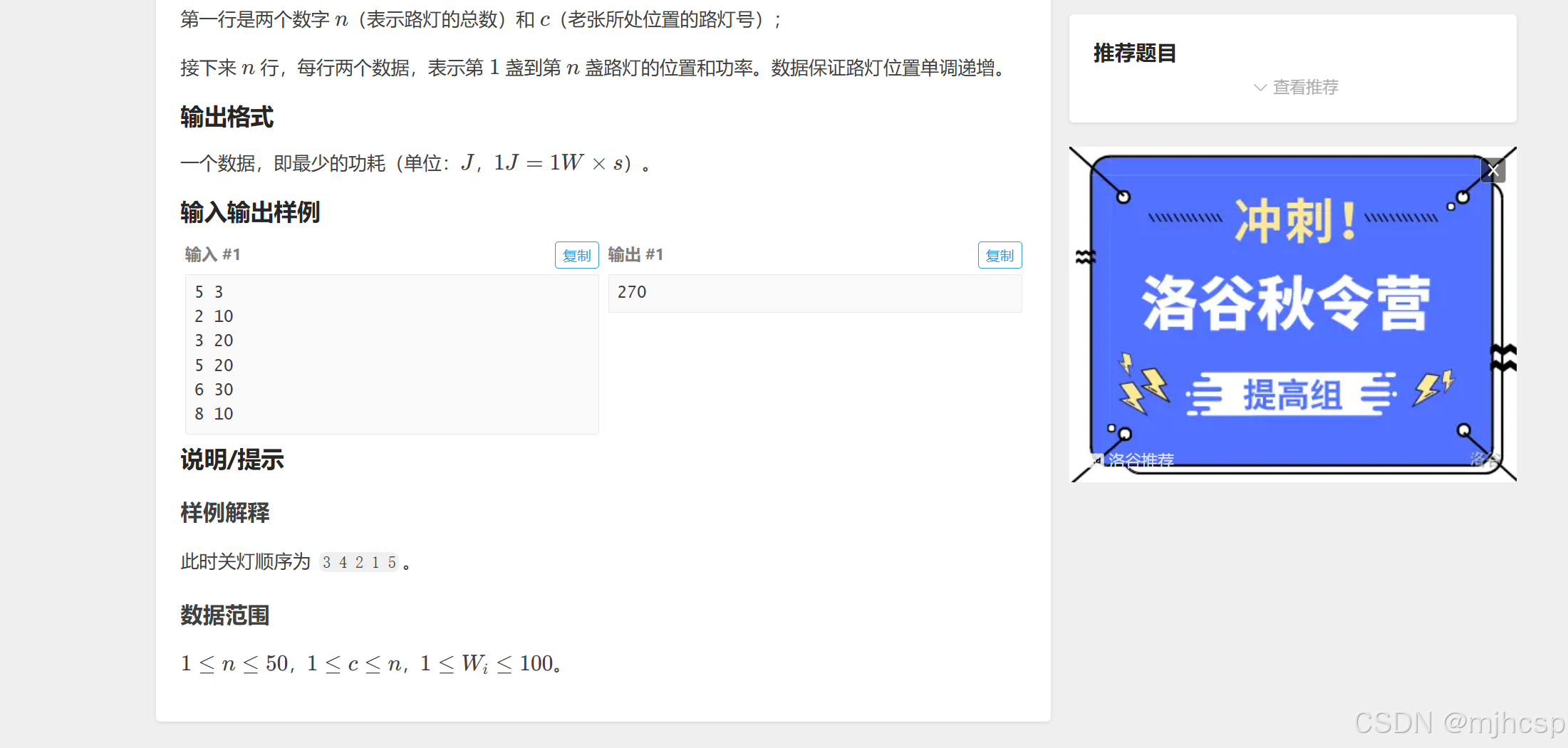 这道题是典型的动态规划 问题,核心思路 是通过状态定义 和转移方程 ,找到关灯的最优顺序 ,使得总耗电量最小 。