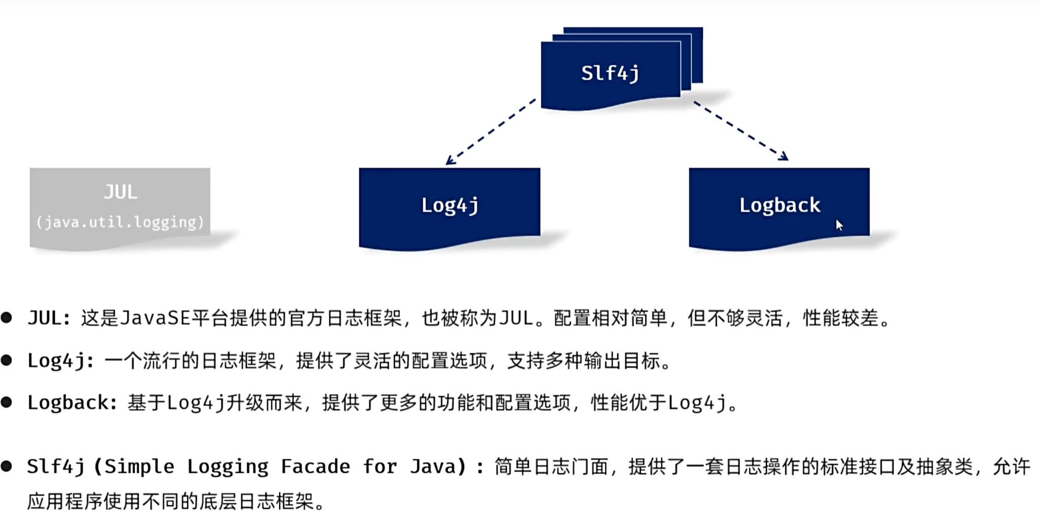 JUL : 是java.util.logging这个单词的简写,大家可以看到,这其实就是个包结构,,这是JavaSE平台提供的官方日志框架,也被称为JUL。配置相对简单,但不够灵活,性能较差,所以在现在的项目开发中,这个JUL用的很少,这个大家知道一下。