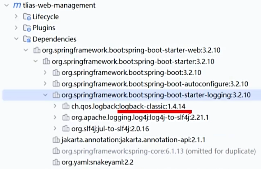 1). 准备工作:引入logback的依赖(springboot中无需引入,在springboot中已经传递了此依赖)。Logback-classic这项依赖已经传递下来了,我们就不用再引入了。