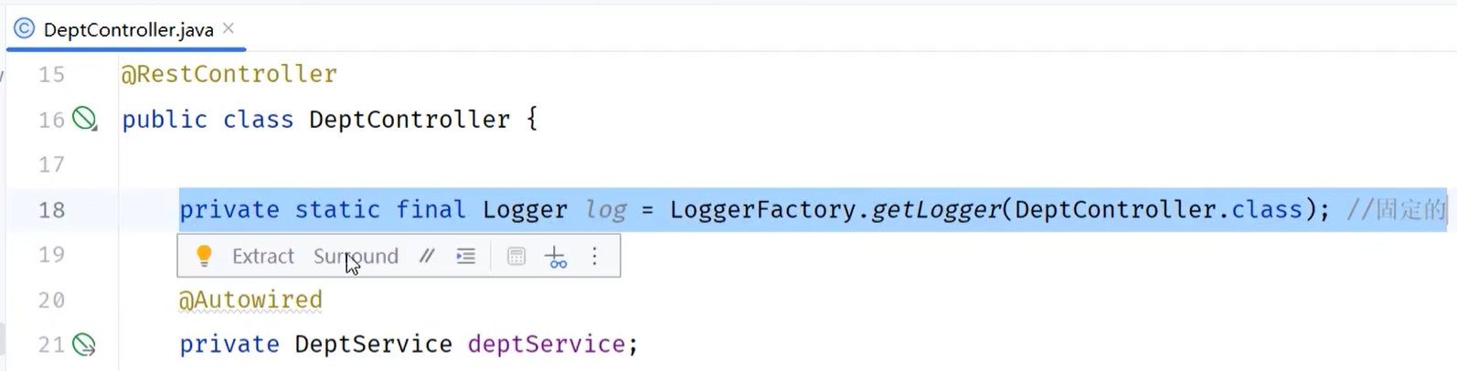 定义日志记录对象,通常来说,我们会在类中声明这个常量,就是Logger这个类型的,然后紧接着通过LoggerFactory这个工厂调用它里面的这个getLogger这个方法就可以获取到一个日志记录对象,而在调用这个方法的时候,里面需要传递当前类的这个字节码对象,用来标识那这个日志记录对象要记录的是哪个类当中的日志,而这句代码是固定写法,也就说只要大家需要去记录日志,你就可以在类中直接声明这么一个常量,然后就可以调用这个日志对象logger当中的方法来记录日志了