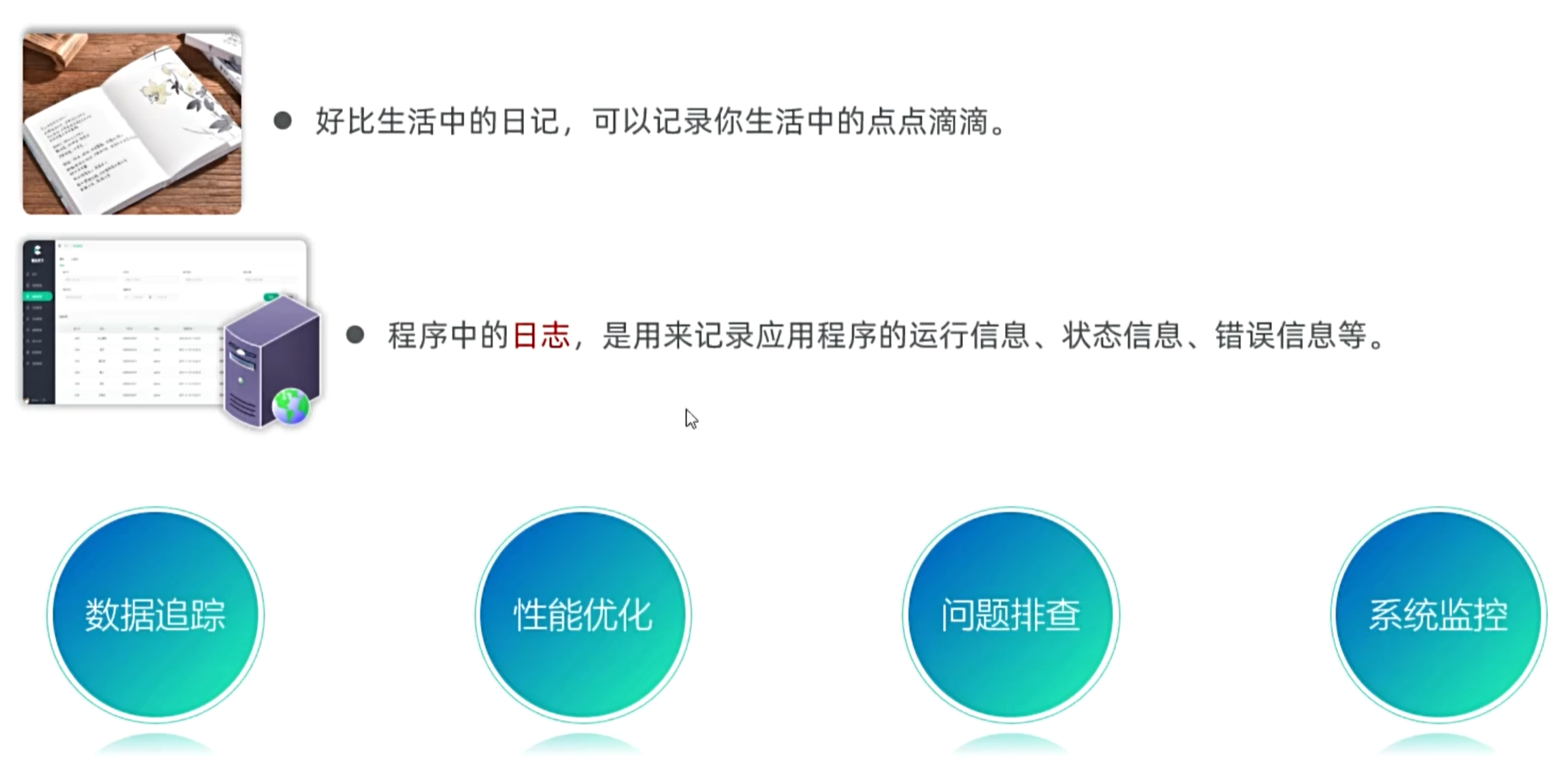 最后一个方面,便于我们进行系统的监控,通过我们在日志当中所记录的程序的运行信息,状态信息,那我们就能够知道这个系统的运行情况如何,以及这个系统中的数据谁在什么时间点对这条数据进行了操作,以及执行的是什么样的操作,那这些我们都可以记录在日志当中,从而来监控整个系统。