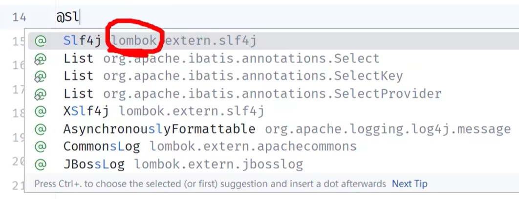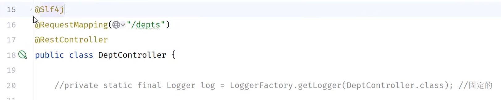 如果在项目中,我们使用了Lambok的话,那这时候这句代码你就不用写了,直接在类上加上一个注解就可以了,而这个注解就叫@Slf4j,大家注意,这是lombok提供的