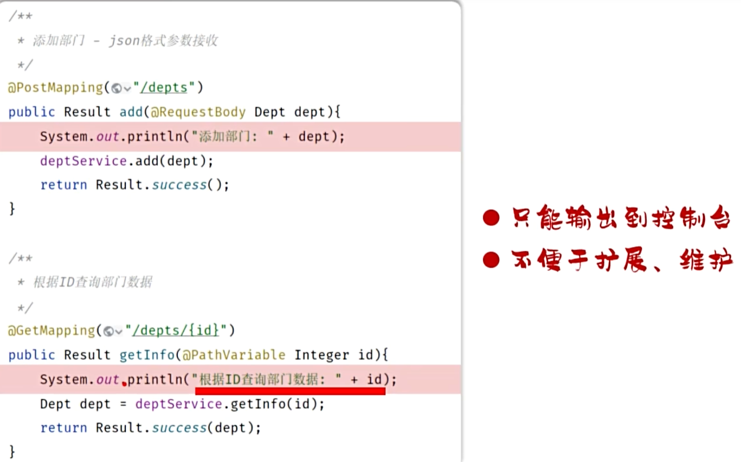 首先大家都知道System是标准输出,就是往控制台当中来输出数据,如果我们基于这种方式来记录日志,那我们所记录的日志数据,它只能输出到控制台,是没有办法记录到日志文件或者记录到数据库中的,所以这是它的第一个问题,只能输出到控制台,一旦我将控制台的数据清空了,这个日志呢也就没有了