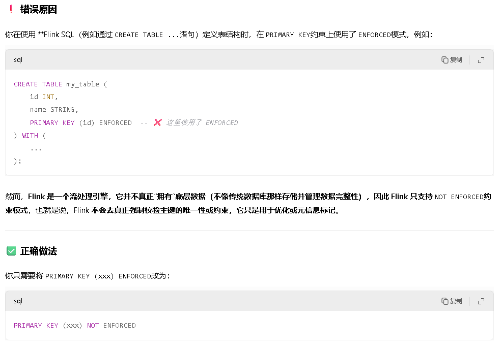 id INT NOT NULL primary key 修改为 id INT NOT NULL PRIMARY KEY NOT ENFORCED