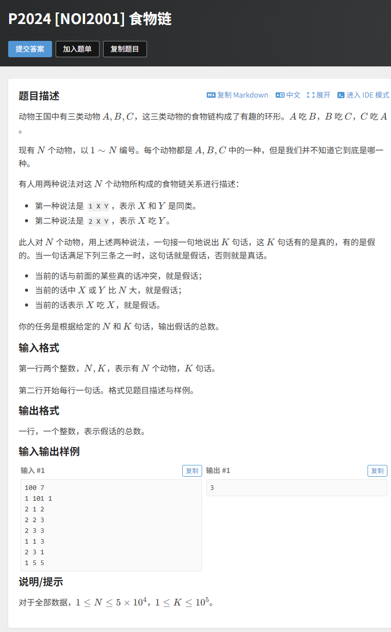 [2.4 带权并查集实战 1:洛谷 P2024 食物链(用权值表示种类关系)](#2.4 带权并查集实战 1:洛谷 P2024 食物链(用权值表示种类关系))