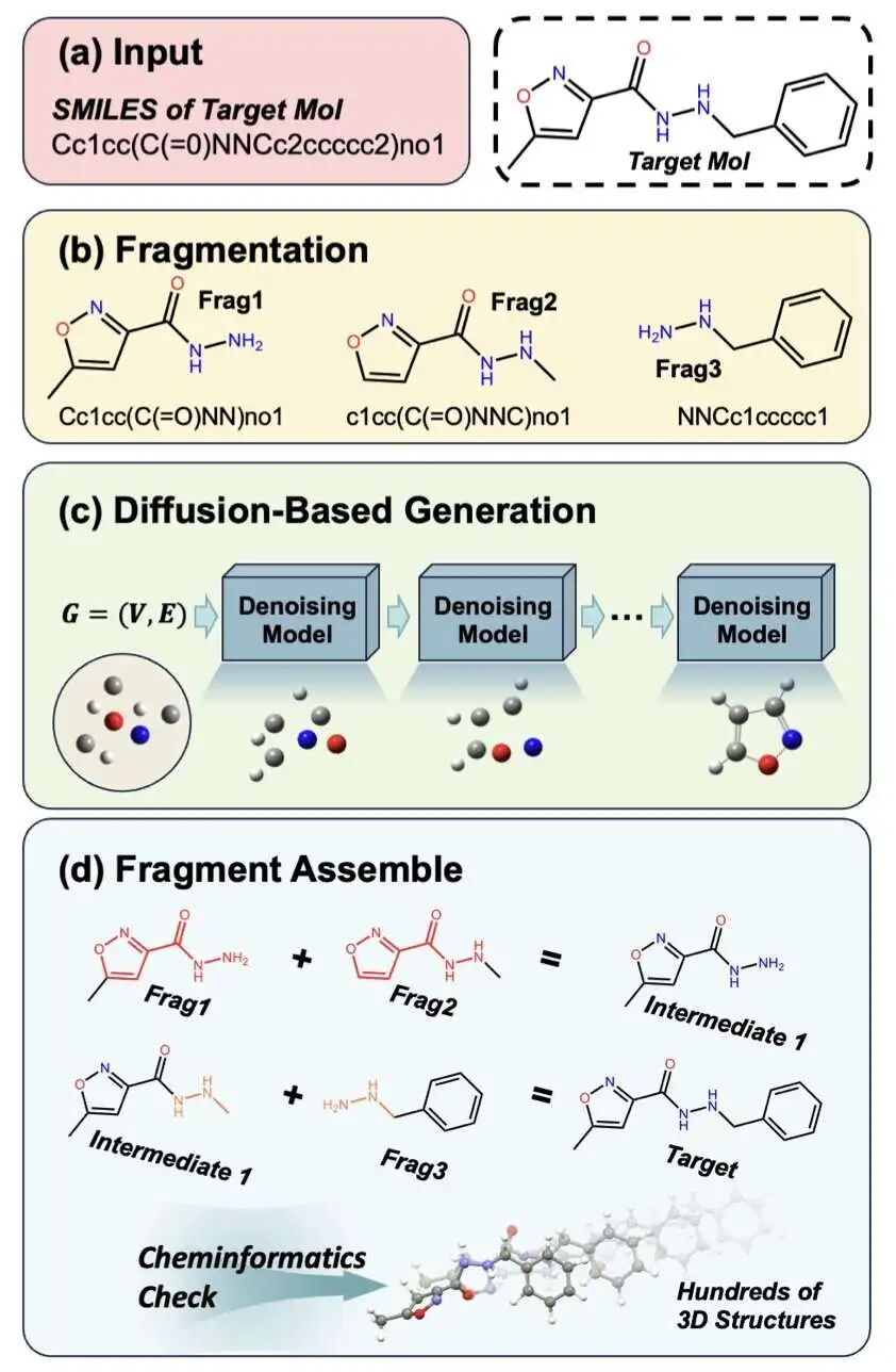 这一操作将预测整个大分子复杂折叠的难题,转化为多个简单的局部 3D 生成任务。现有的扩散模型在小分子数据上训练充分,能轻松处理这些碎片。系统随后依据连接点信息,将生成好的 3D 碎片重新组装。这种方法有效避开了大分子数据不足的障碍。