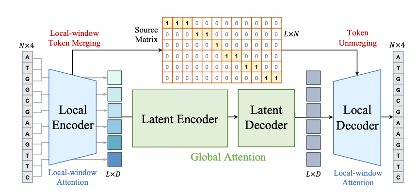 MergeDNA 引入了「变焦镜头」式的分层架构。它利用局部编码器(Local Encoder)配合可微分的 Token 合并(Token Merging)技术解决这一难题。