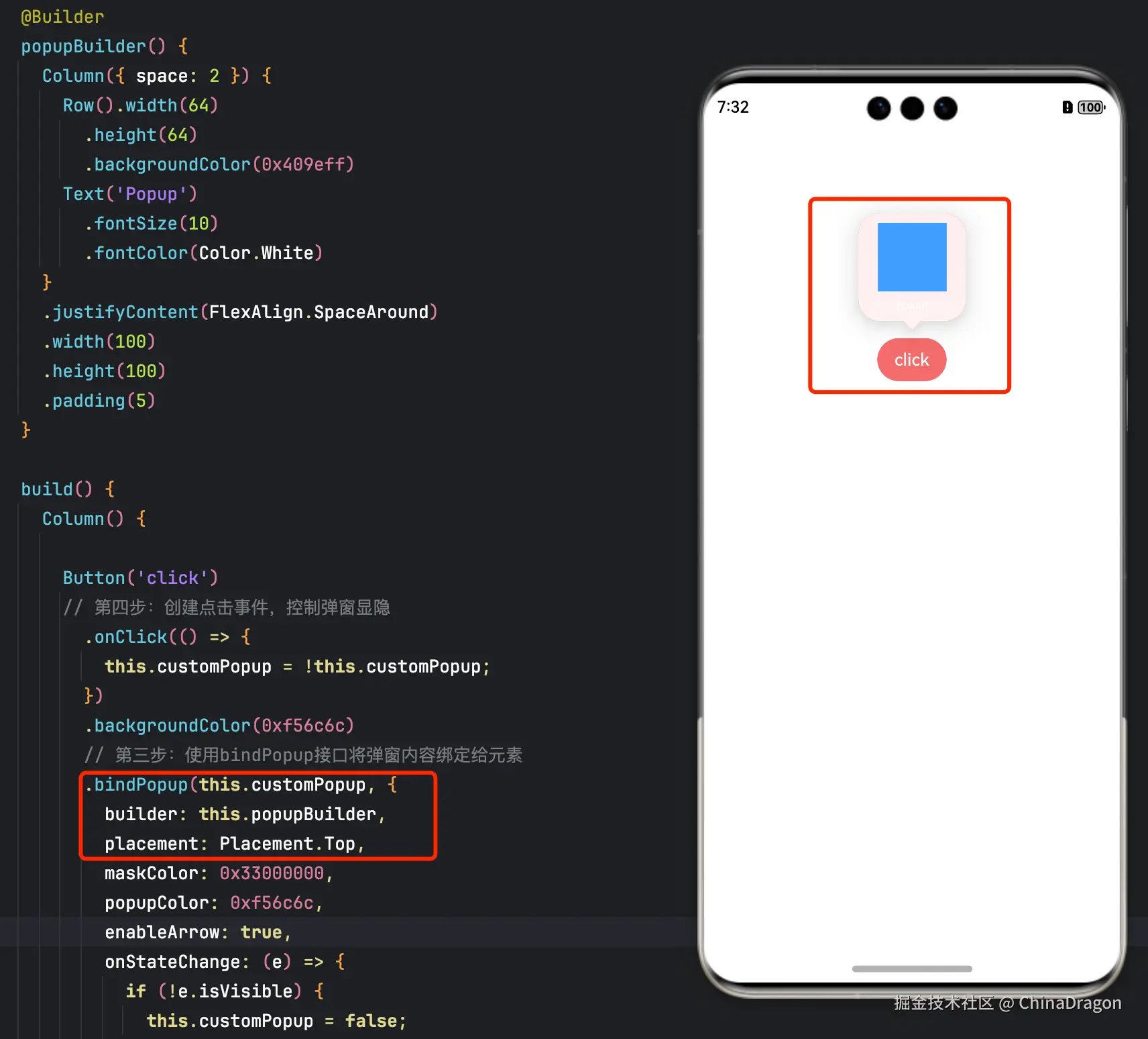 bindPopup 属性可为组件绑定弹窗,并设置弹窗内容,交互逻辑和显示状态。