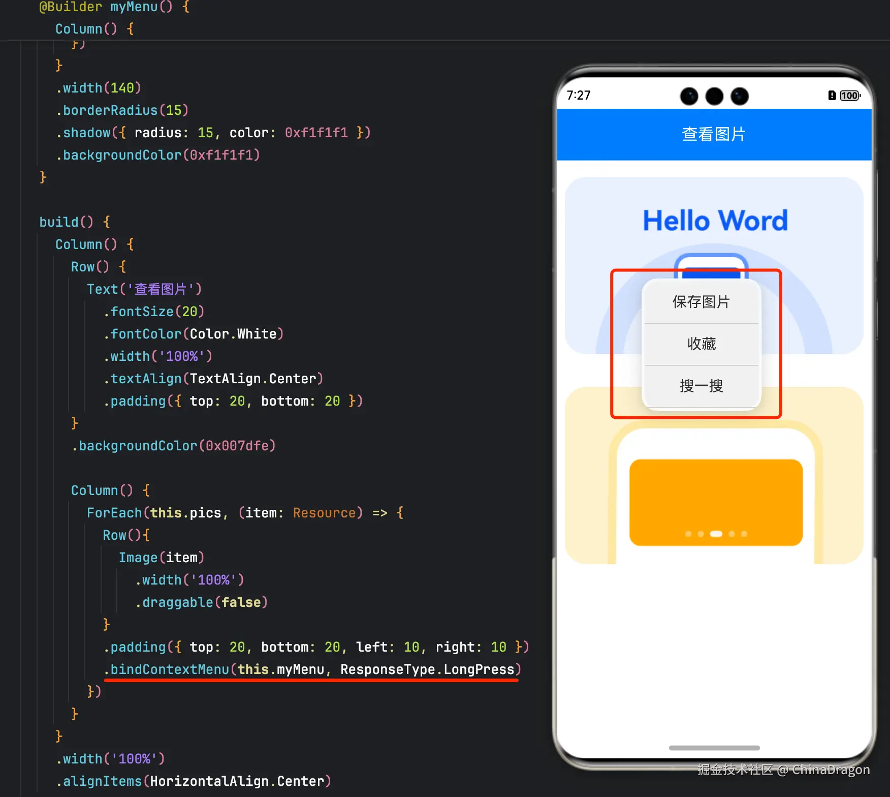 bindContextMenu为组件绑定弹出式菜单,通过长按或右键点击触发。