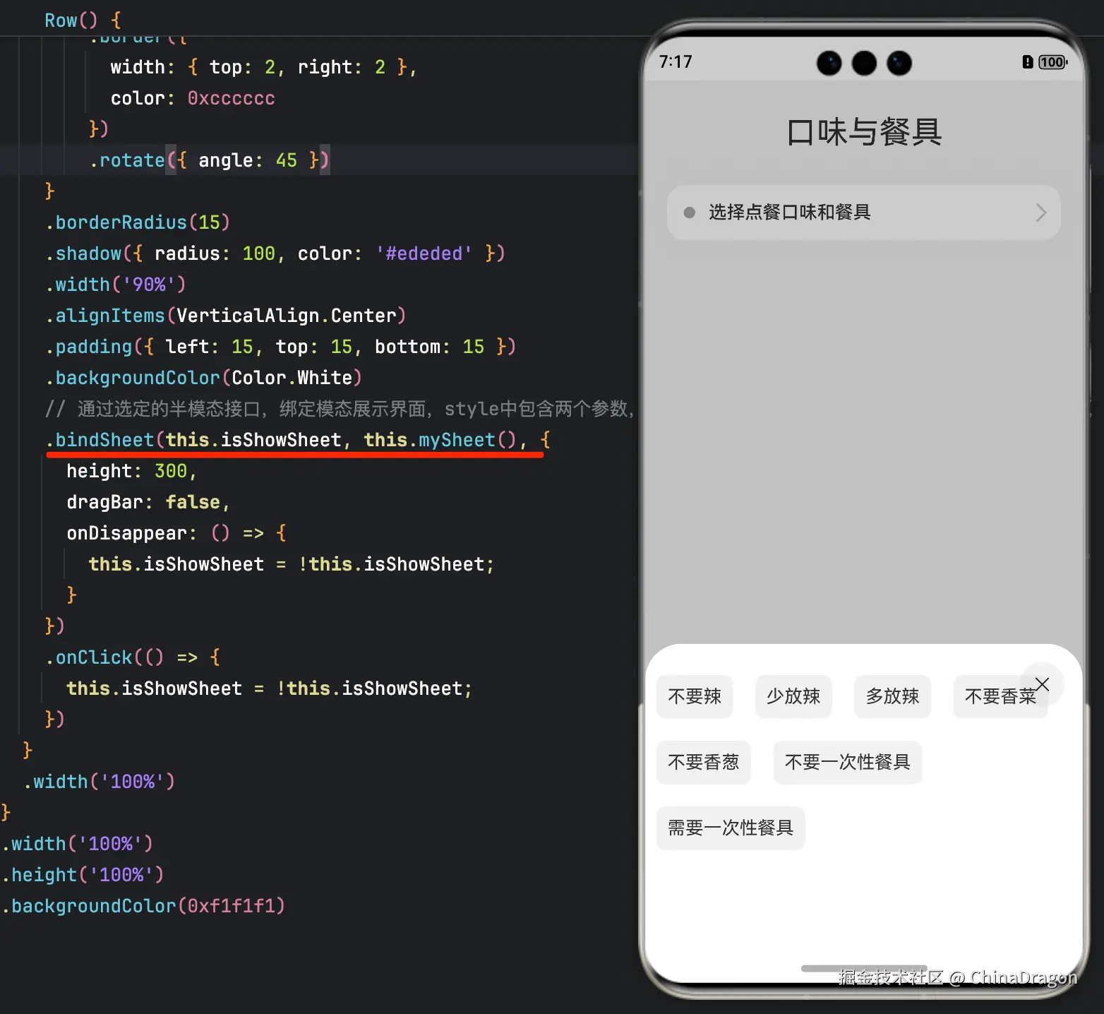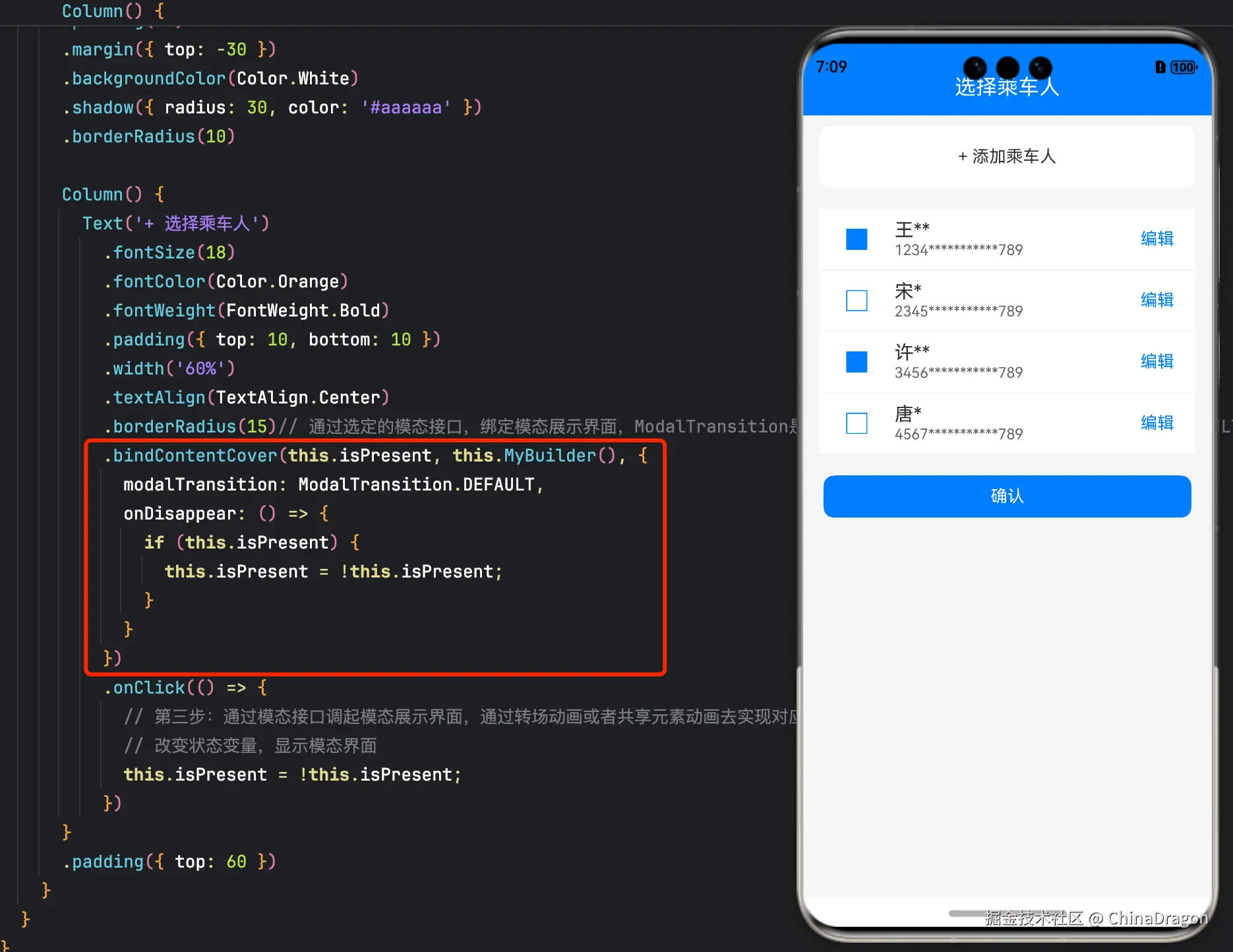 上述模态转场接口需要绑定到其他组件上,通过监听状态变量改变调起模态界面。同时,也可以通过if范式,通过新增/删除组件实现模态转场效果。