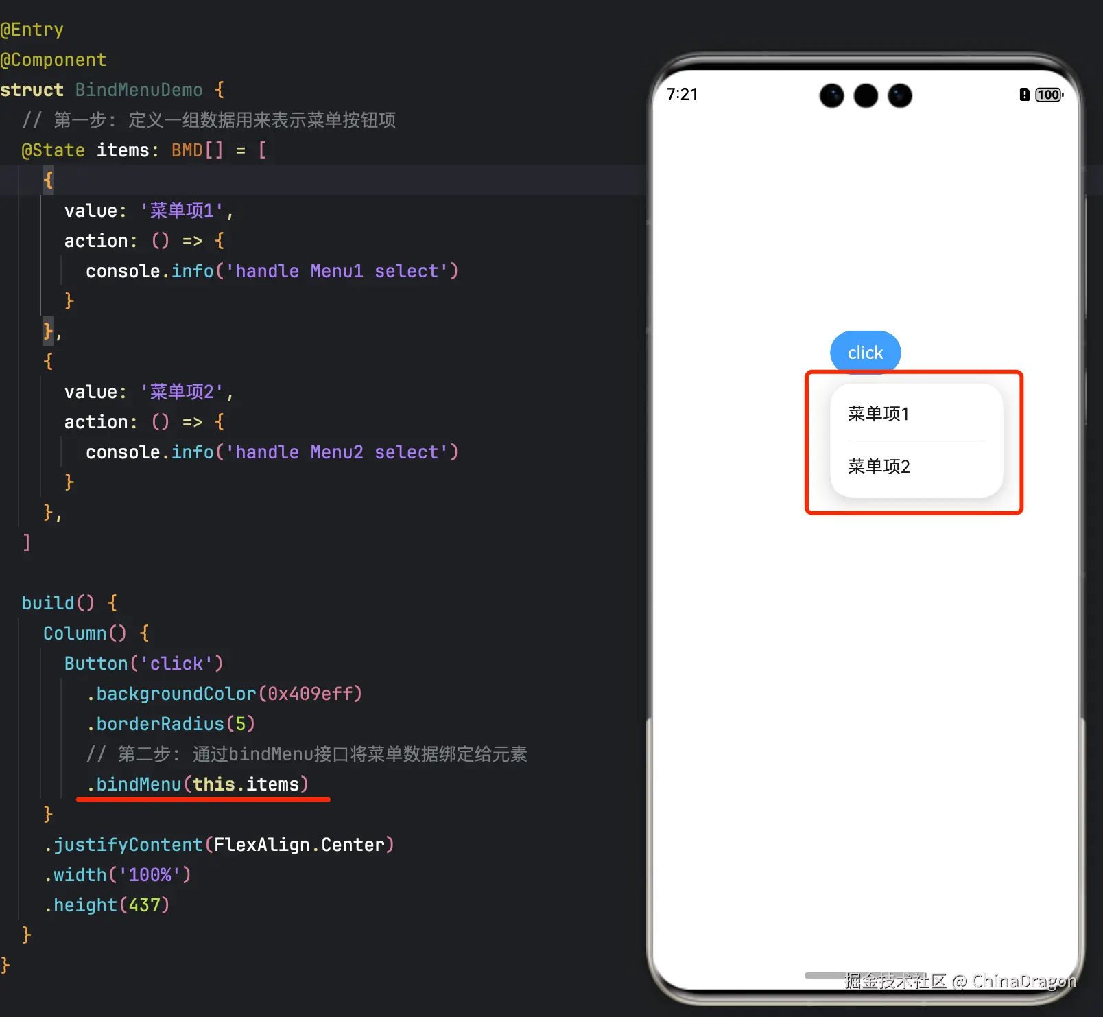 | bindMenu | 弹出菜单,点击组件后弹出。 | 需要Menu菜单的场景,如一般应用的"+"号键。 |