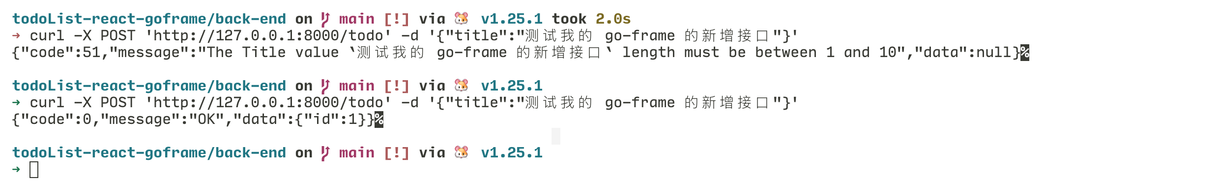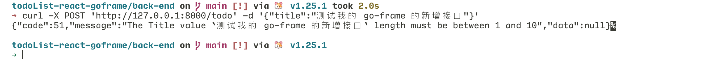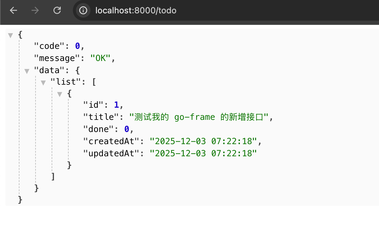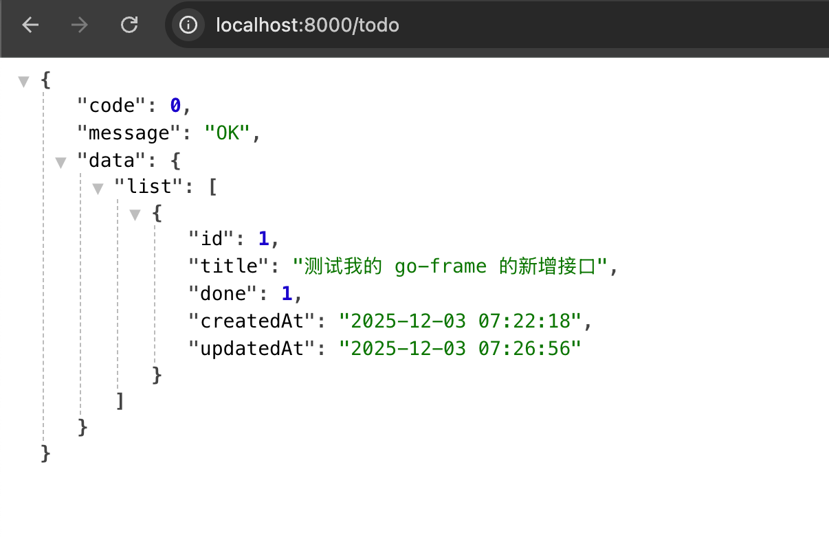 curl -X POST 'http://127.0.0.1:8000/todo' -d '{"title":"测试我的 go-frame 的新增接口"}'