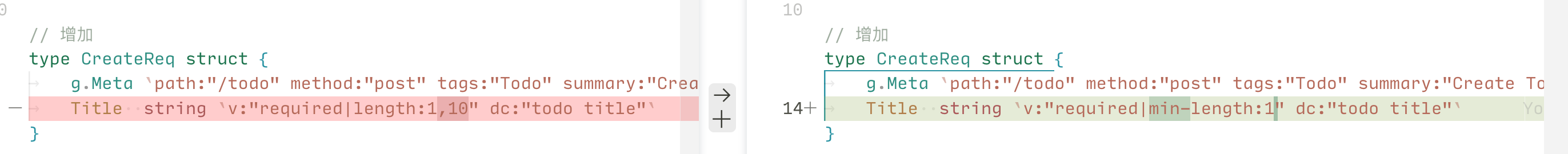 Title *string `v:"length:1,10" dc:"todo title"`