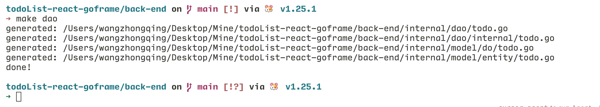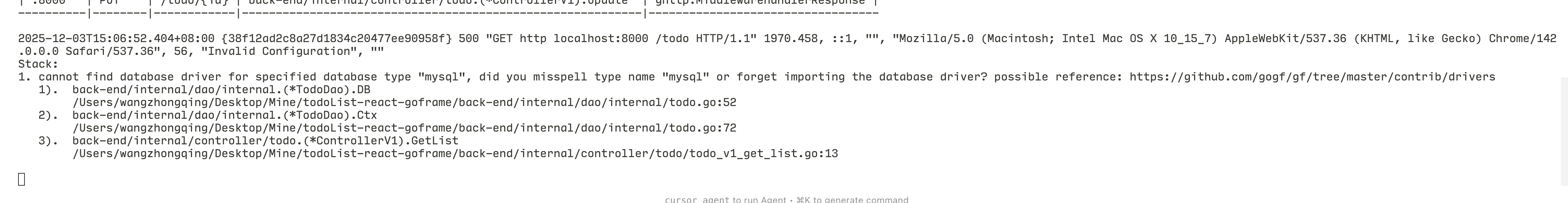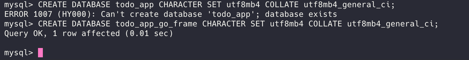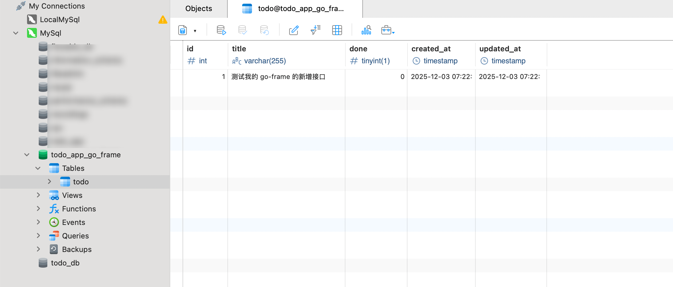 然后创建一个数据库,发现我之前已经有 todo_app 的数据库了,那就创建一个叫 todo_app_go_frame 的数据库