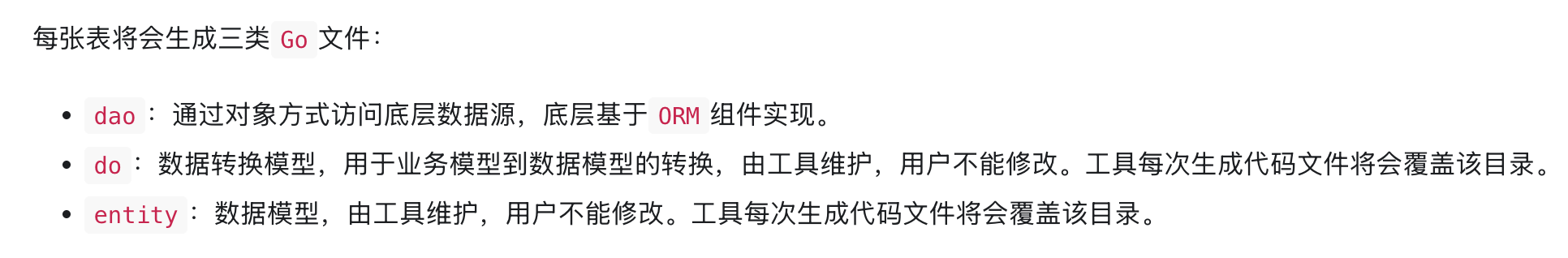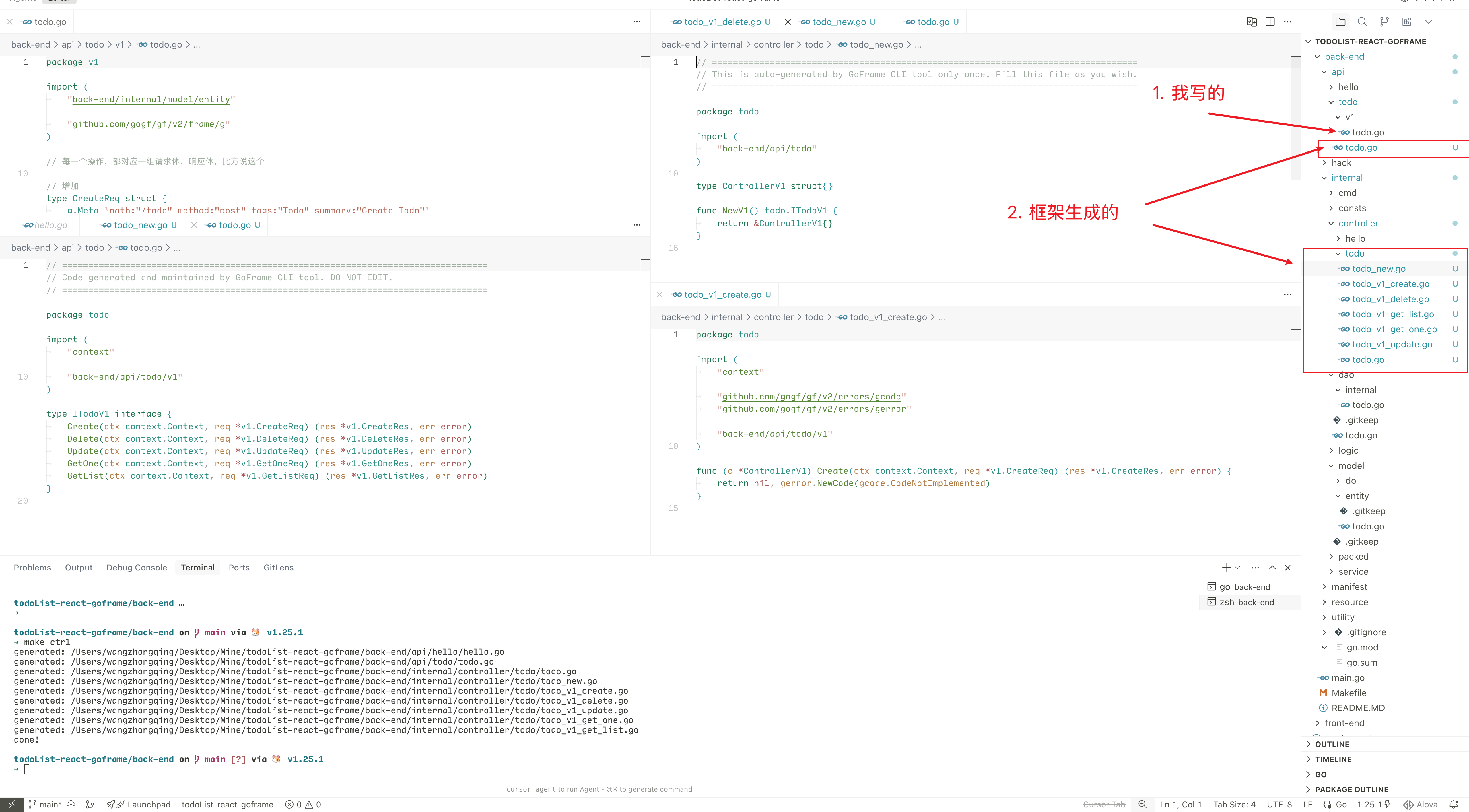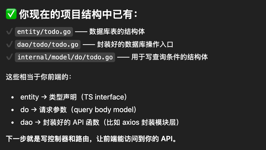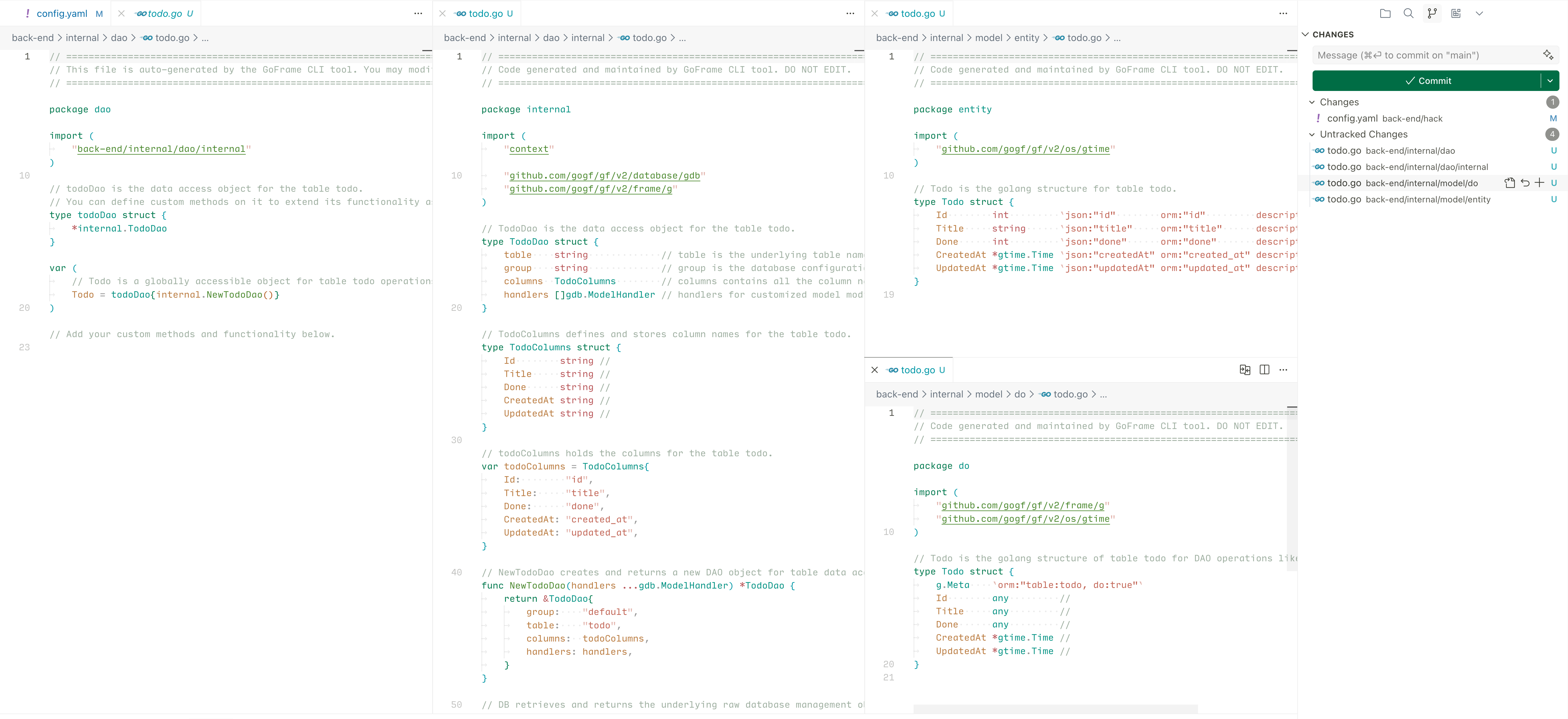 其中的三个文件都有 Code generated and maintained by GoFrame CLI tool. DO NOT EDIT. 的标记,说明他是自动生成的,每次生成都会被覆盖掉的