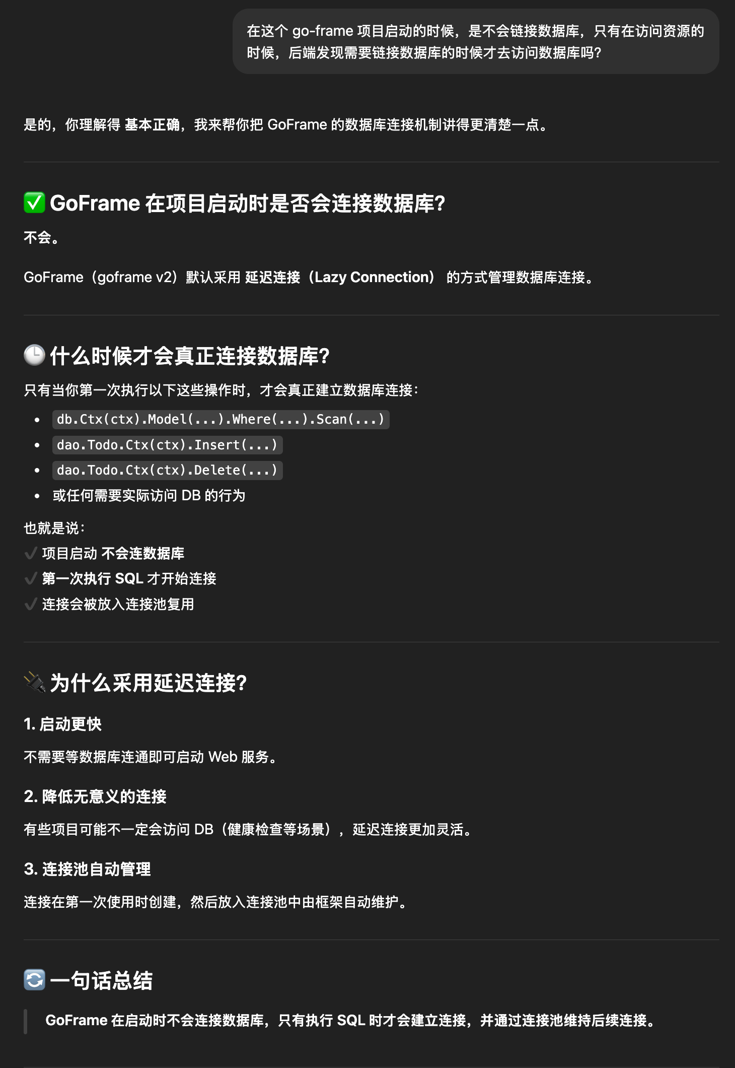 问题:所以,我理解的是,在这个 go 项目启动的时候,是不会再启动的时候去链接数据库,只有在访问资源的时候,后端发现需要链接数据库的时候才去访问数据库?