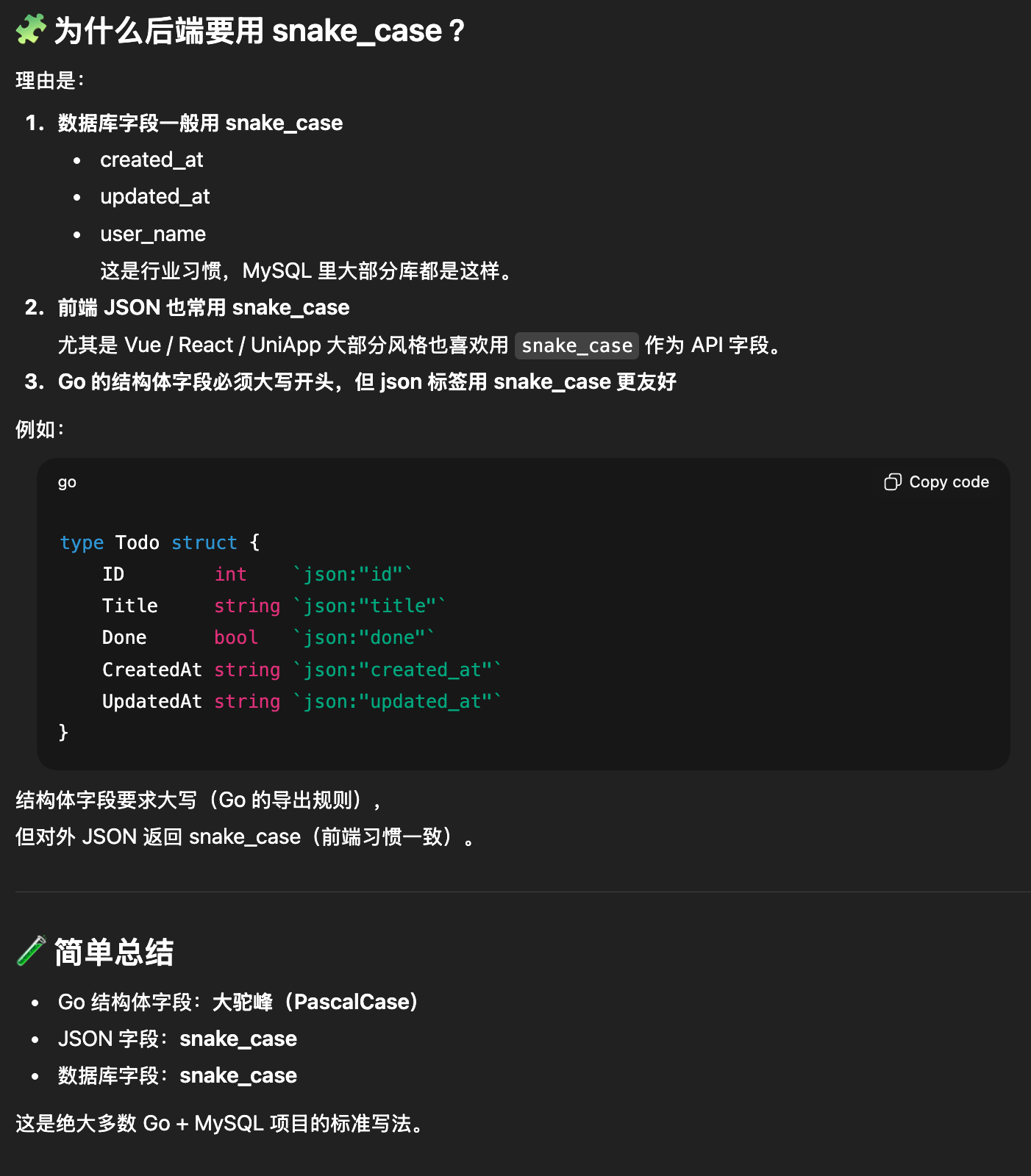 原文:只有返回的参数结构体中带有 json 标签,因为返回的数据往往需要转换为 json 格式给前端使用,通过 snake 的参数命名的方式更符合前端命名习惯这个 snake 命名是什么?