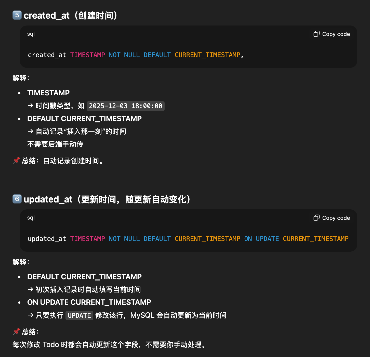 updated_at TIMESTAMP NOT NULL DEFAULT CURRENT_TIMESTAMP ON UPDATE CURRENT_TIMESTAMP -- 更新时间,更新时自动刷新