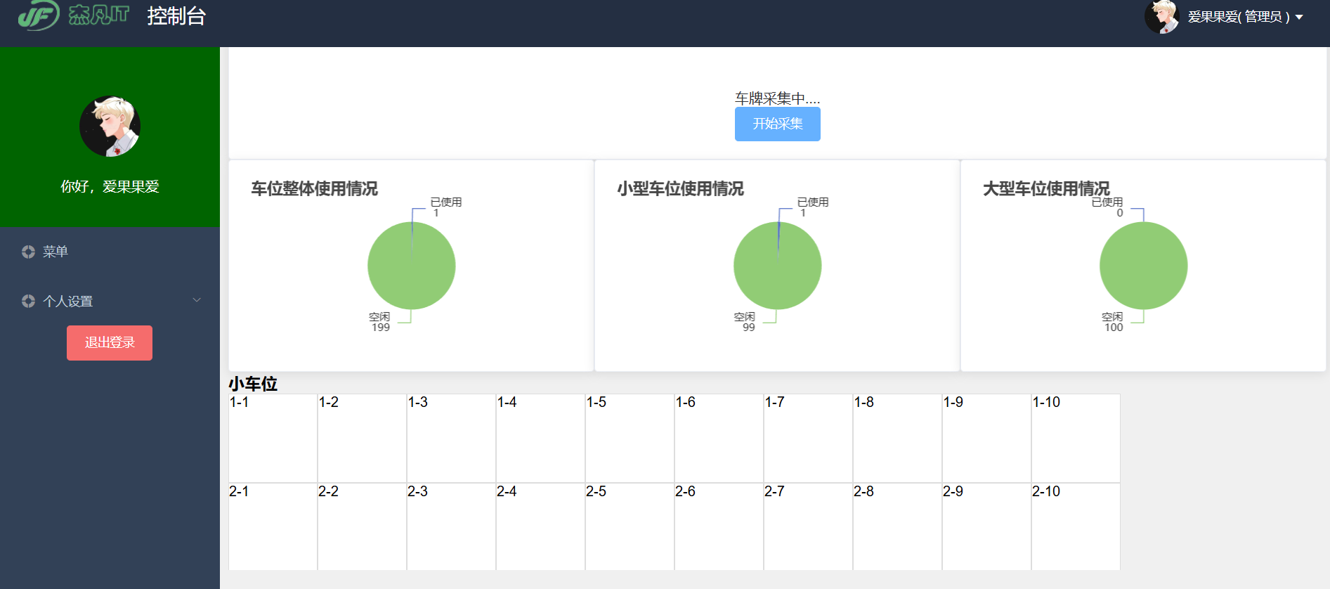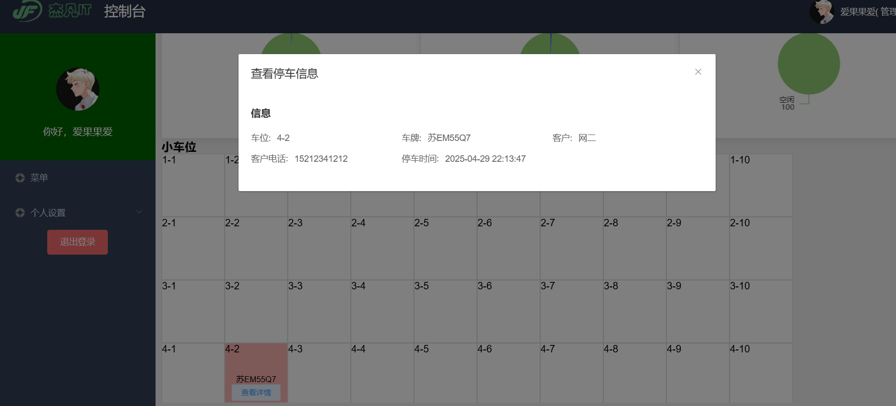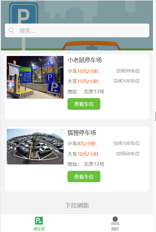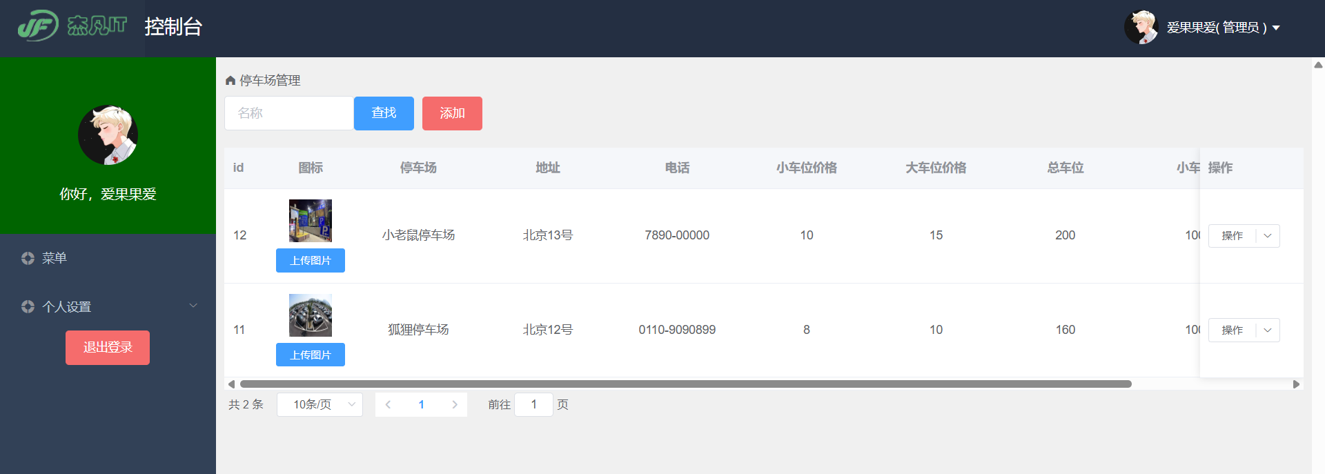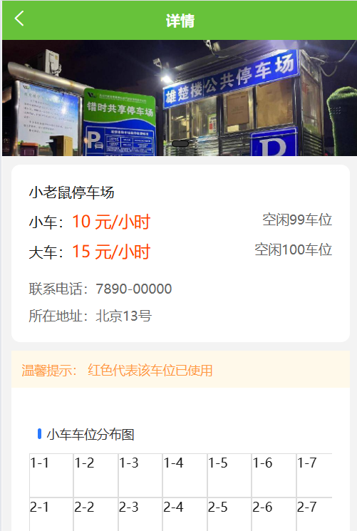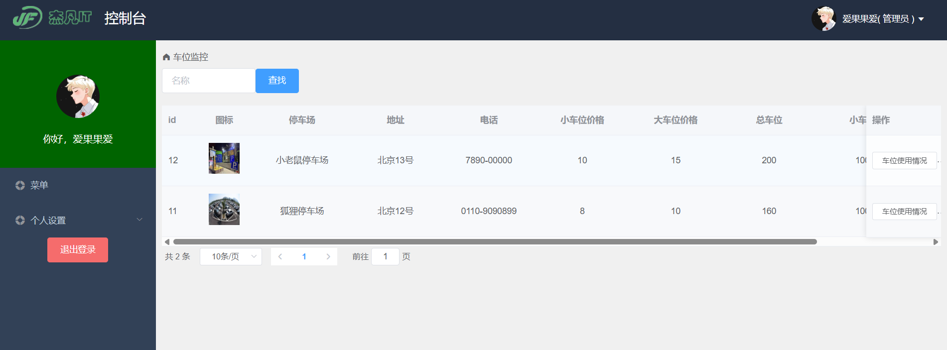 tc_parklot),包括名称、地址、联系电话、总车位数、大小车位数量及对应的收费标准(smallprice、bigprice)。 - 车位状态监控 :实时查看和管理所有车位(