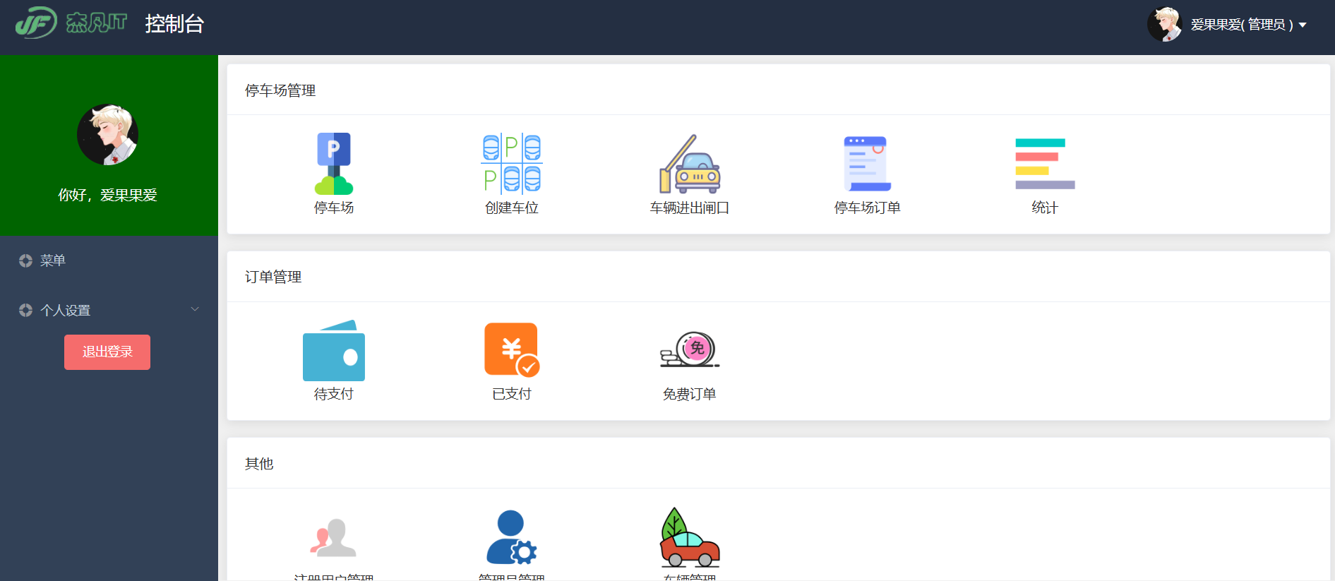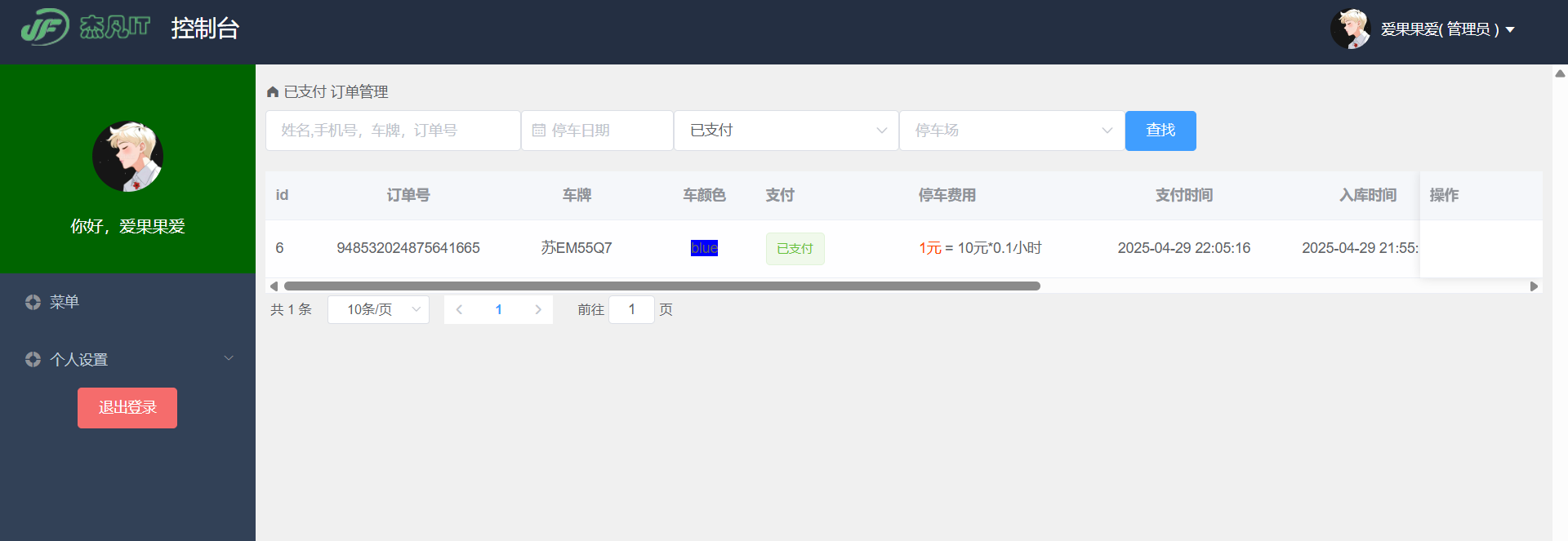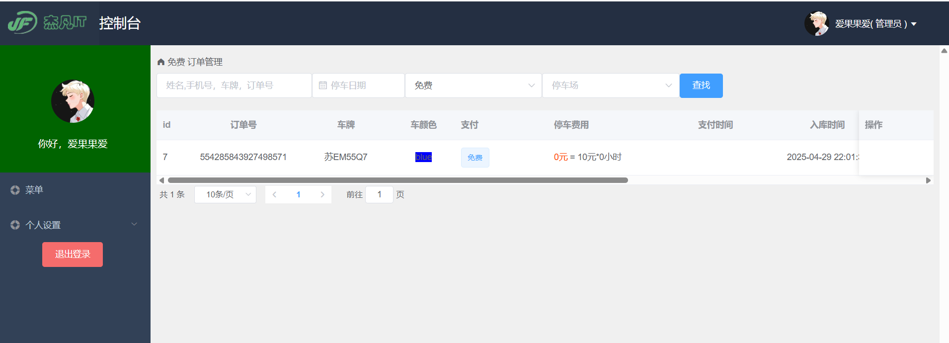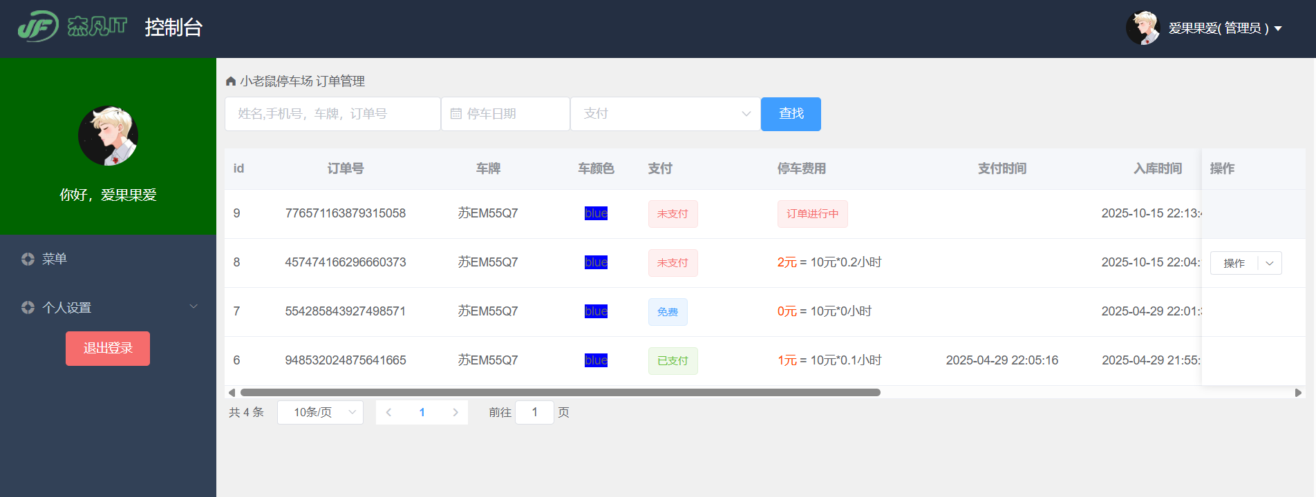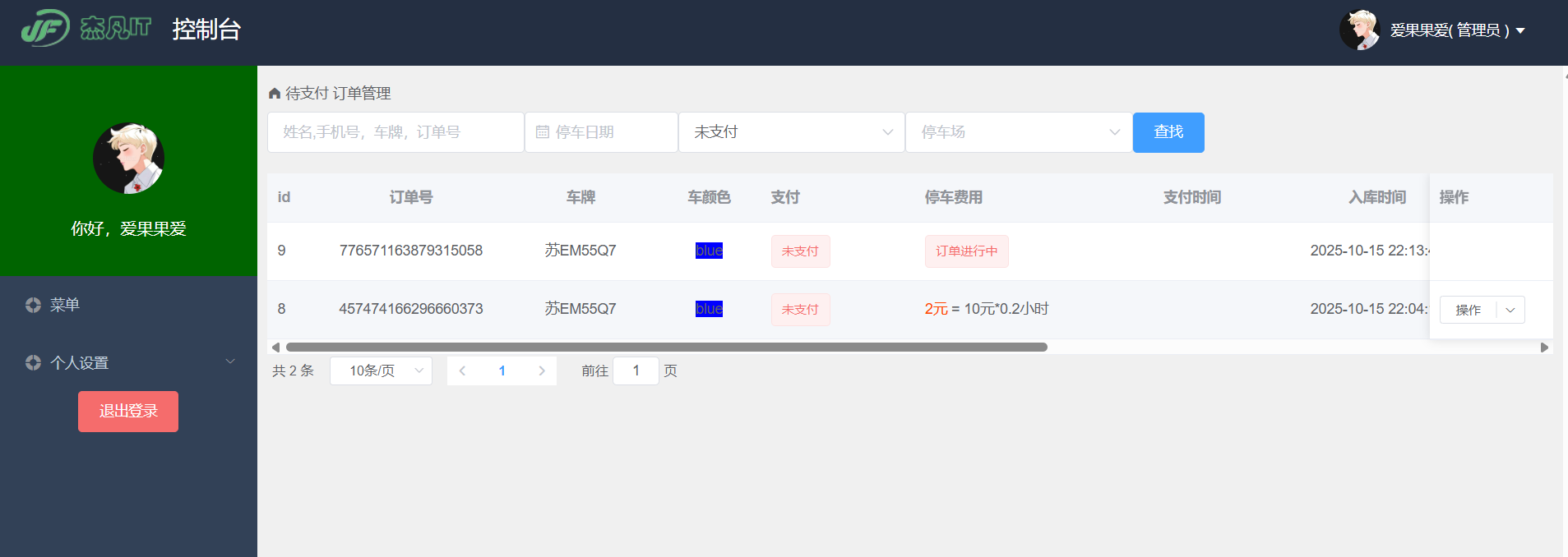 tc_bill),包括订单号、停车时长、应收费用、实付金额、支付状态(未支付、已支付、免费)等。 - 用户及权限管理 :管理系统用户(