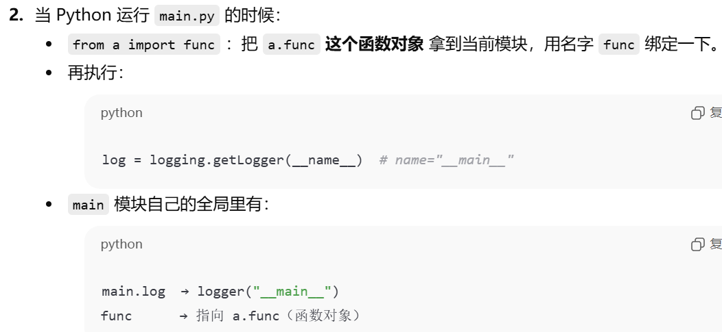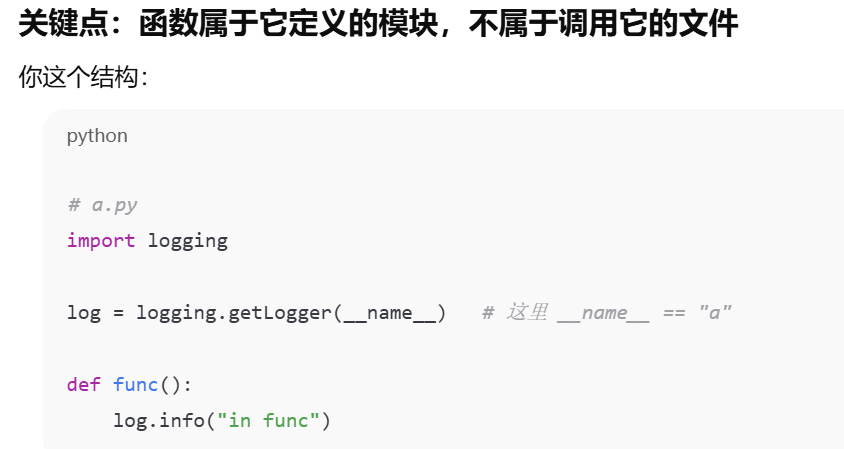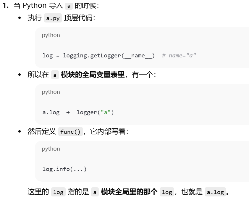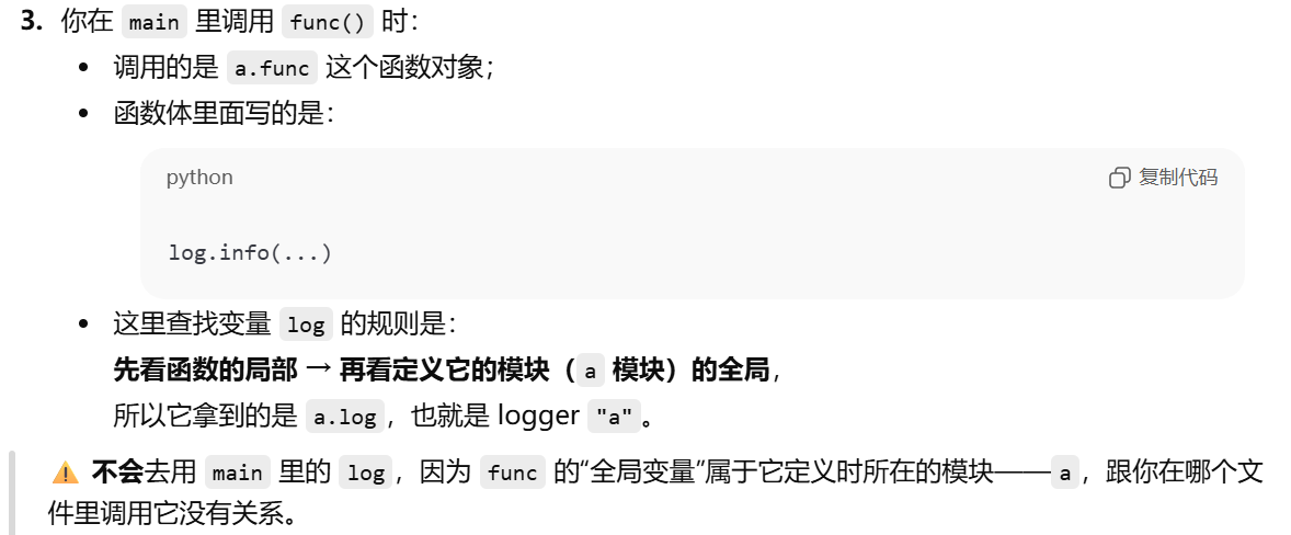 - [不只是 log,函数体里用到的所有"全局变量"都是先回自己定义所在的模块去找的,而不是去调用它的那个文件里找。](#不只是 log,函数体里用到的所有“全局变量”都是先回自己定义所在的模块去找的,而不是去调用它的那个文件里找。)
