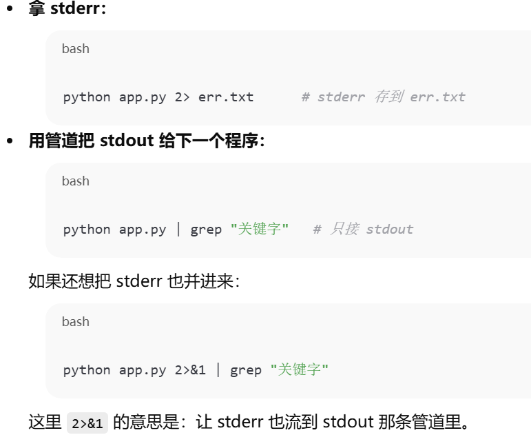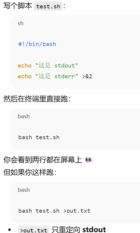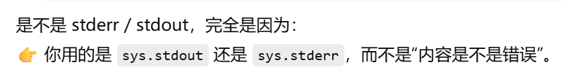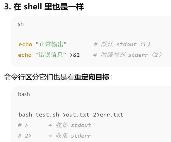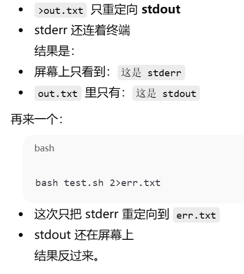 谁写到 stdout / stderr,不是看"内容像不像错误",而是看它到底往哪个文件描述符写:1(stdout)还是 2(stderr)。