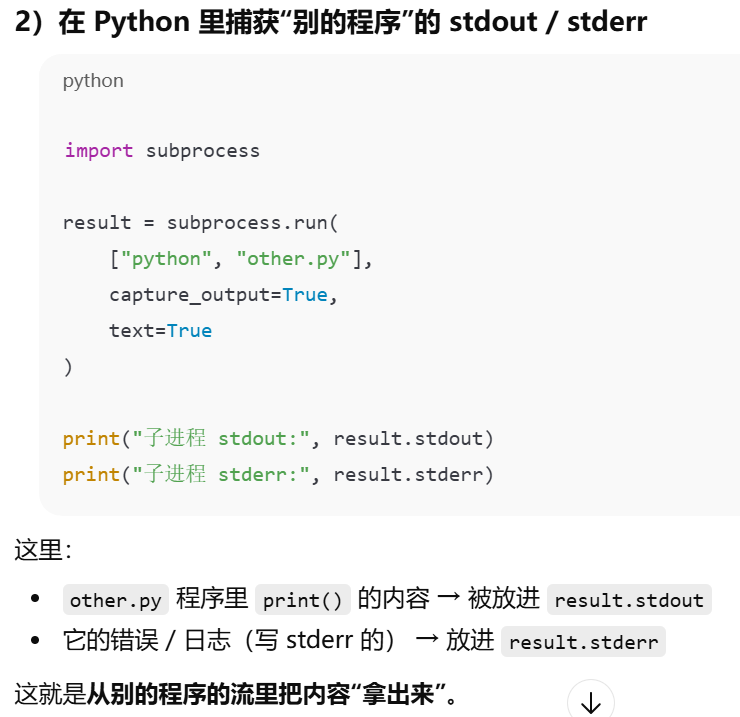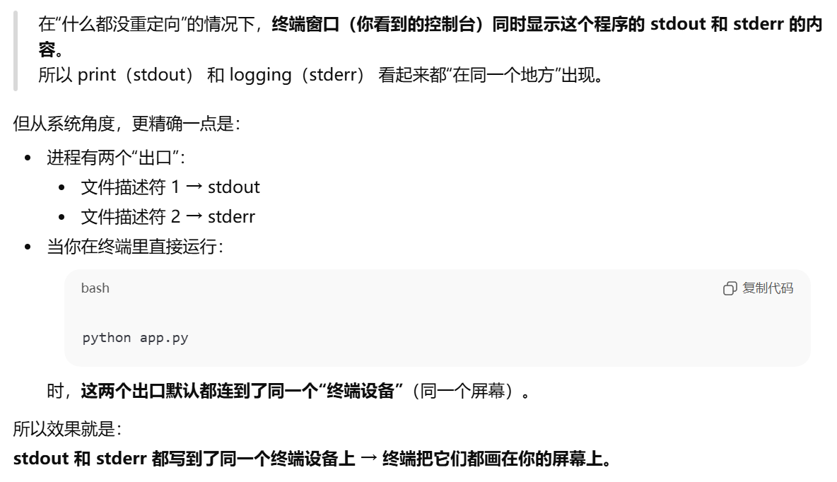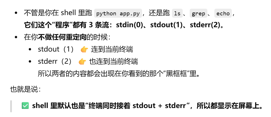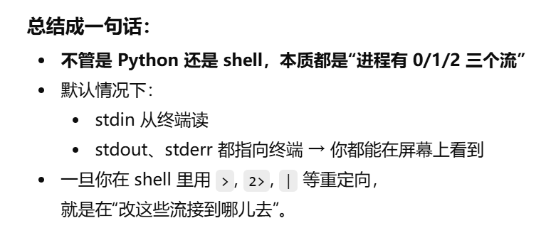 不管是 Python 还是 shell,本质都是"进程有 0/1/2 三个流",默认情况下:stdin 从终端读,stdout、stderr 都指向终端 → 你都能在屏幕上看到