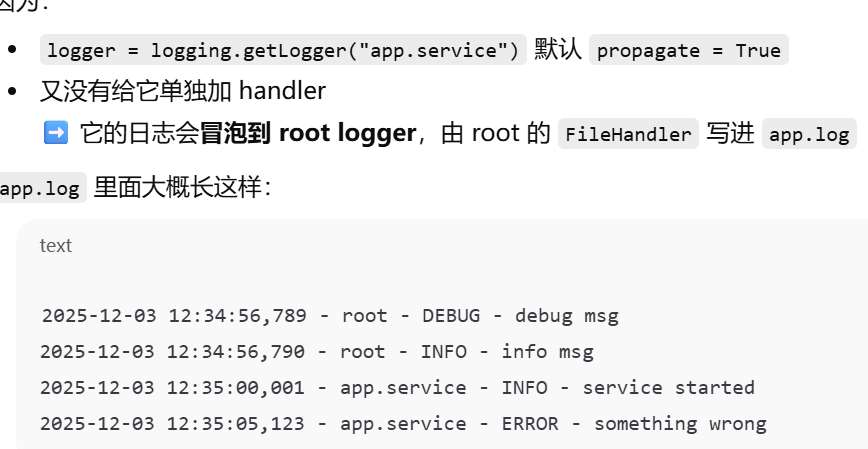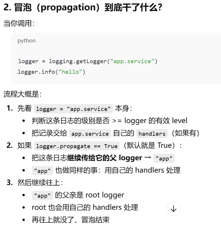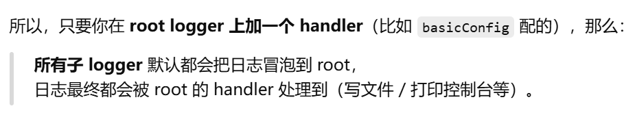 日志从子 logger 一路往父 logger 传,最后传到 root 的过程,就像气泡往上浮一样。Python logging 里官方叫 propagation。